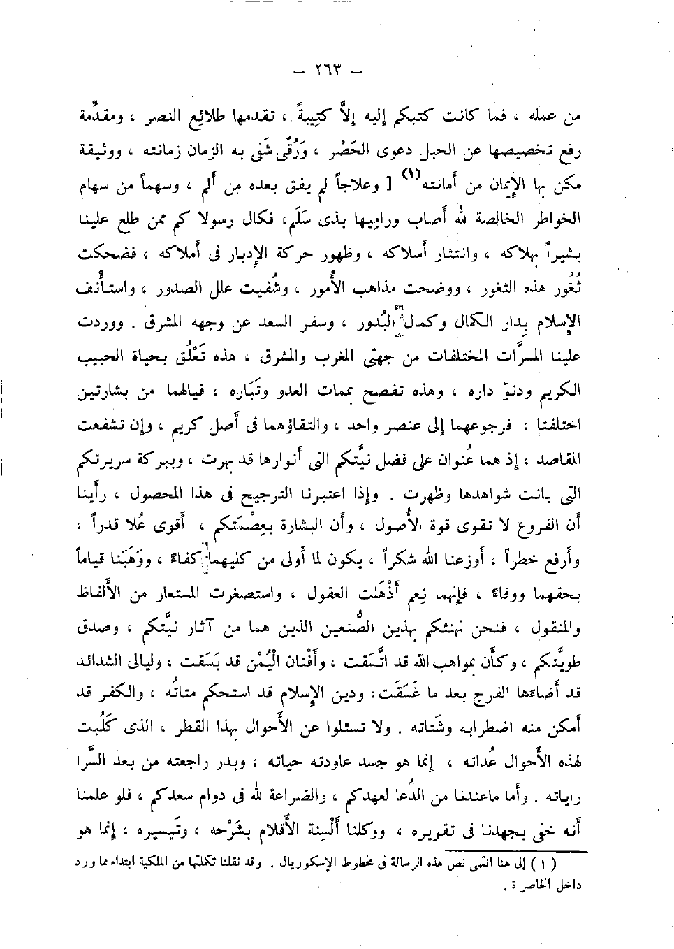من عمله، فَمَا كَانَت كتبكم إِلَيْهِ إِلَّا كَتِيبَة، تقدمها طلائع النَّصْر، ومقدمة رفع تخصيصها عَن الْجَبَل دَعْوَى الْحصْر، ورقى شفى بِهِ الزَّمَان زمانته، ووثيقة مكن بهَا الْإِيمَان من أَمَانَته [وعلاجا لم يفق بعده من ألم، وَسَهْما من سِهَام الخواطر الْخَالِصَة لله أصَاب وراميها بِذِي سلم، فكال رَسُولا كم مِمَّن طلع علينا بشيرا بهلاكه، وانتثار أسلاكه، ظُهُور حَرَكَة الإدبار فِي أملاكه، فَضَحكت ثغور هَذِه الثغور، ووضحت مَذَاهِب الْأُمُور، وشفيت علل الصُّدُور، واستأنف الْإِسْلَام بدار الْكَمَال وَكَمَال البدور، وسفر السعد عَن وَجهه الْمشرق. ووردت علينا المسرات المختلفات من جهتي الْمغرب والمشرق، هَذِه تعلق بحياة الحبيب الْكَرِيم ودنو دَاره، وَهَذِه تفصح بممات الْعَدو وتباره، فيا لَهما من بشارتين اختلفتا، فرجوعهما إِلَى عنصر وَاحِد، والتقاؤهما فِي أصل كريم، وَإِن تشفعت الْمَقَاصِد، إِذْ هما عنوان على فضل نيتكم الَّتِي أنوارها قد بهرت، وببركة سريرتكم الَّتِي بَانَتْ شواهدها وَظَهَرت. وَإِذا اعْتبرنَا التَّرْجِيح فِي هَذَا الْمَحْصُول، رَأينَا أَن الْفُرُوع لَا تقوى قُوَّة الْأُصُول، وَأَن الْبشَارَة بعصمتكم، أقوى علا قدرا، وَأَرْفَع خطرا، أوزعنا الله شكرا، يكون لما أولى من كليهمَا كفاء، وَوَهَبْنَا قيَاما بحقهما ووفاء، فَإِنَّهُمَا نعم أذهلت الْعُقُول، واستصغرت الْمُسْتَعَار من الْأَلْفَاظ وَالْمَنْقُول، فَنحْن نهنئكم بِهَذَيْنِ الصنعين الَّذين هما من آثَار نيتكم، وَصدق طويتكم، وَكَأن بمواهب الله قد اتسقت، وأفنان الْيمن قد بسقت، وليالي الشدائد قد أضاءها الْفرج بعد مَا غسقت، وَدين الْإِسْلَام قد استحكم متاته، وَالْكفْر قد أمكن مِنْهُ اضطرابه وشتاته. وَلَا تسئلوا عَن الْأَحْوَال بِهَذَا الْقطر، الَّذِي كلبت لهَذِهِ الْأَحْوَال عداته، إِنَّمَا هُوَ جَسَد عاودته حَيَاته، وَبدر راجعته من بعد السرا راياته. وَأما مَا عندنَا من الدعا لعهدكم، والضراعة لله فِي دوَام سعدكم، فَلَو علمنَا أَنه خَفِي بجهدنا فِي تَقْرِيره، ووكلنا أَلْسِنَة الأقلام بشرحه، وتيسيره، إِنَّمَا هُوَ