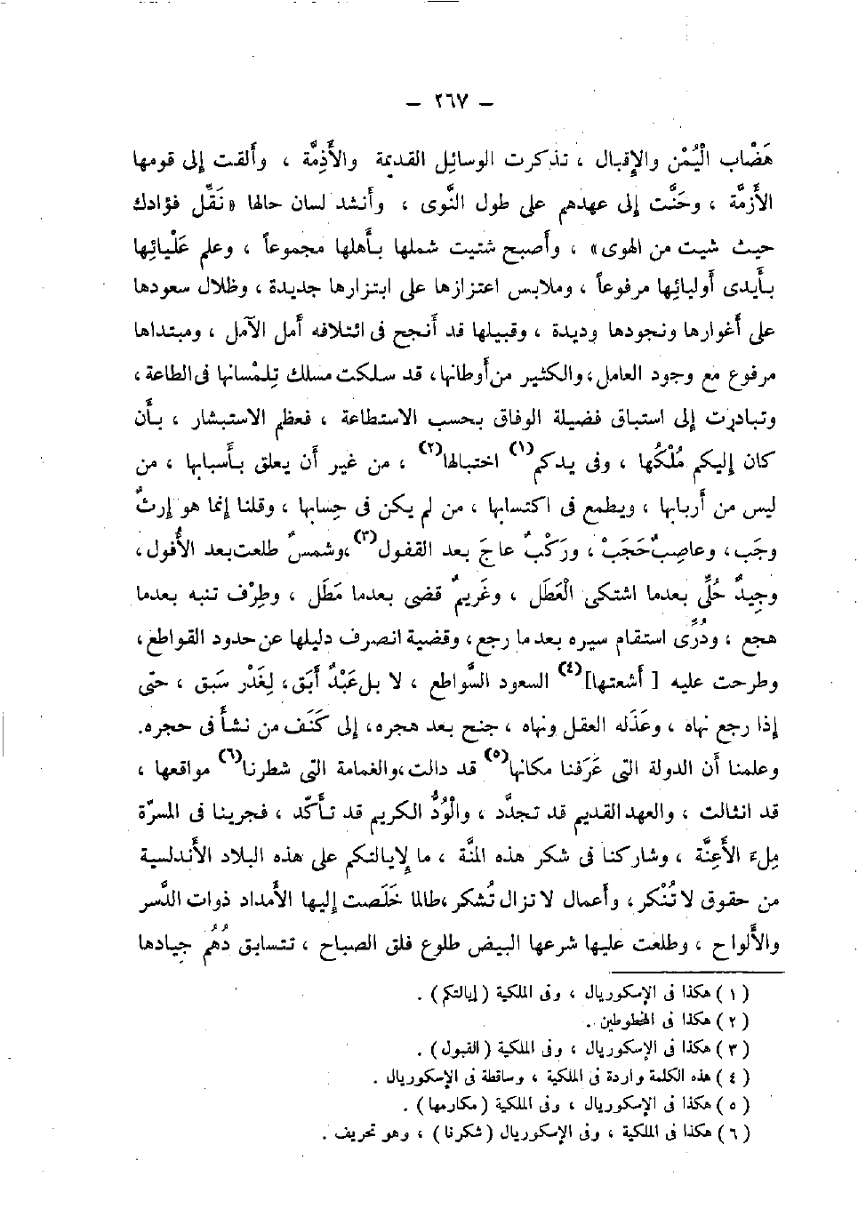هضاب الْيمن والإقبال، تذكرت الْوَسَائِل الْقَدِيمَة والأذمة، والقت إِلَى قَومهَا الأزمة، وحنت إِلَى عَهدهم على طول النَّوَى، وَأنْشد لِسَان حَالهَا " نقل فُؤَادك حَيْثُ شيت من الْهوى "، وَأصْبح شتيت شملها بِأَهْلِهَا مجموعا، وَعلم عليائها بأيدي أوليائها مَرْفُوعا، وملابس اعتزازها على ابتزارها جَدِيدَة، وظلال سعودها على أغوارها ونجودها وديدة، وقبيلها قد أنجح فِي ائتلافه أمل الآمل، ومبتداها مَرْفُوع مَعَ وجود الْعَامِل، وَالْكثير من أوطانها، قد سلكت مَسْلَك تلمسانها فِي الطَّاعَة، وتبادرت إِلَى استباق فَضِيلَة الْوِفَاق بِحَسب الِاسْتِطَاعَة، فَعظم الاستبشار، بِأَن كَانَ إِلَيْكُم ملكهَا، وَفِي يدكم اختبالها، من غير أَن يعلق بأسبابها، من لَيْسَ من أَرْبَابهَا، ويطمع فِي اكتسابها، من لم يكن فِي حِسَابهَا، وَقُلْنَا إِنَّمَا هُوَ إِرْث وَجب، وعاصب حجب، وَركب عاج بعد القفول، وشمس طلعت بعد الأفول، وجيد حلى بَعْدَمَا اشْتَكَى العطل، وغريم قضى بَعْدَمَا مطل، وطرف تنبه بَعْدَمَا هجع، ودرى استقام سيره بَعْدَمَا رَجَعَ، وَقَضِيَّة انْصَرف دليلها عَن حُدُود القواطع، وطرحت عَلَيْهِ [أشعتها] السُّعُود السواطع، لَا بل عبد أبق، لغدر سبق، حَتَّى إِذا رَجَعَ نَهَاهُ، وعذله الْعقل وَنَهَاهُ، جنح بعد هجره، إِلَى كنف من نَشأ فِي حجره. وَعلمنَا أَن الدولة الَّتِي عرفنَا مَكَانهَا قد دالت، والغمامة الَّتِي شطرنا مواقعها، قد انثالت، والعهد الْقَدِيم قد تجدّد، والود الْكَرِيم قد تَأَكد، فجرينا فِي المسرة ملْء الأعنة، وشاركنا فِي شكر هَذِه الْمِنَّة، مَا لإيالتكم على هَذِه الْبِلَاد الأندلسية من حُقُوق لَا تنكر، وأعمال لَا تزَال تشكر، طالما خلصت إِلَيْهَا الأمداد ذَوَات الدسر والألواح، وطلعت عَلَيْهَا شرعها الْبيض طُلُوع فلق الصَّباح، تتسابق دهم جيادها