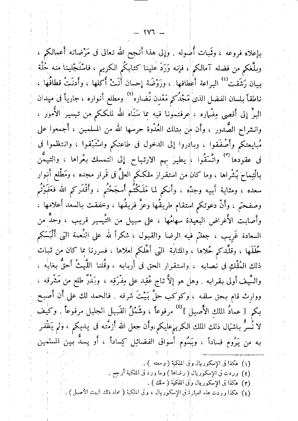 بإعلاء فروعه، وثبات أُصُوله. وَإِلَى هَذَا أنجح الله تَعَالَى فِي مرضاته أَعمالكُم، وبلغكم من فَضله آمالكم، فَإِنَّهُ ورد علينا كتابكُمْ الْكَرِيم، فاستجلينا مِنْهُ حلَّة بَيَان رشقت البراعة أعطافها، وروضة إِحْسَان أَتَت أكلهَا، وأدنت قطافها، ناطقا بِلِسَان الْفضل الَّذِي مجدكم مَعْدن نضاره ومطلع أنواره، جَارِيا فِي ميدان الْبر إِلَى أقْصَى مضماره، عرفتمونا فِيهِ بِمَا سناه الله لملككم من تيسير الْأُمُور، وانشراح الصُّدُور، وَأَن من بِتِلْكَ العدوة حرسها الله من الْمُسلمين، أَجمعُوا على مبايعتكم وأصفقوا، وَبَادرُوا إِلَى الدُّخُول فِي طاعتكم واستبقوا، وانتظموا فِي عقودها واتسقوا، يطير بهم الارتياح إِلَى التَّمَسُّك بعراها، والتيمن بالتماح بشراها، وَمَا كَانَ من اسْتِقْرَار ملككم الْعلي فِي قَرَار مجده، ومطلع أنوار سعده، ومثابة أَبِيه وجده، وأنكم لما ملكتم أسجحتم، وأقدركم الله فعفوتم وصفحتم، وَأَن دعوتكم استقام طريقها وَعز فريقها، وخفقت بالسعد أعلامها، وأصابت الْأَغْرَاض الْبَعِيدَة سهامها، على سَبِيل من التَّيْسِير قريب، وحد من السَّعَادَة غَرِيب، جعلتم فِيهِ الرِّضَا وَالْقَبُول، شكرا لله على النِّعْمَة الَّتِي ألبسكم حللها، وقلدكم حلاها، والمثابة الَّتِي أهلكم لعلاها، فَسُرِرْنَا بِمَا كَانَ من ثبات ذَلِك الْملك فِي نصابه، واستقرار الْحق فِي أربابه، وَقُلْنَا اللَّيْث أَحَق بغابه، وَالسيف أولى بقرابه. وَهل هُوَ إِلَّا تَاج عقد على مفرقه، وَبدر طلع من مشرقه، ووارث قَامَ بِحَق سلفه. وكوكب حل بَيت شرفه. فَالْحَمْد لَك على أَن أصبح بكم [عماد الْملك الْأَصِيل] مَرْفُوعا، وَشَمل الْقَبِيل الْجَلِيل مَرْفُوعا. وَكَيف لَا نسر باشتمال ذَلِك الْملك الْكَرِيم عَلَيْكُم، وَأَن جعل الله أزمته فِي يديكم، وَلم يظفر بِهِ من يروم فَسَادًا، ويسوم أسواق الْفَضَائِل كسادا، أَو يسد بَين الْمُسلمين