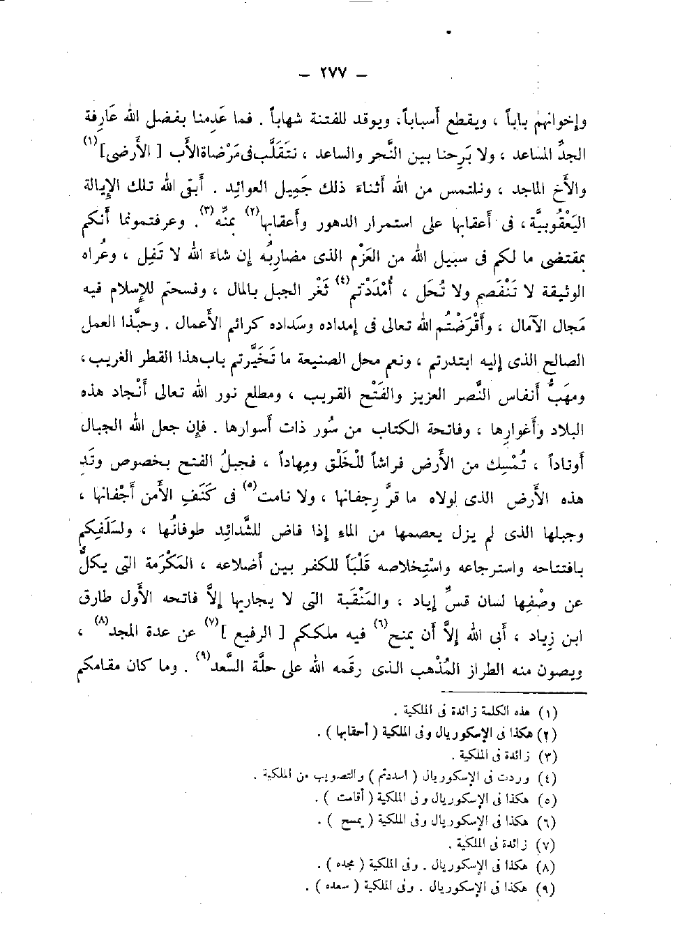 وإخوانهم بَابا، وَيقطع أسباباً، ويوقد للفتنة شهابا. فَمَا عدمنا بِفضل الله عارفة الْجد المساعد، وَلَا برحنا بَين النَّحْر والساعد، نتقلب فِي مرضاة الْأَب [الأرضى] وَالْأَخ الْمَاجِد، ونلتمس من الله أثْنَاء ذَلِك جميل العوائد. أبقى الله تِلْكَ الإيالة اليعقوبية، فِي أعقابها على اسْتِمْرَار الدهور وأعقابها بمنه. وعرفتمونما أَنكُمْ بِمُقْتَضى مَا لكم فِي سَبِيل الله من الْعَزْم الَّذِي مضاربه إِن شَاءَ الله لَا تفل، وعراه الْوَثِيقَة لَا تنفصم وَلَا تحل، أمددتم ثغر الْجَبَل بِالْمَالِ، وفسحتم لِلْإِسْلَامِ فِيهِ مجَال الآمال، وأقرضتم الله تَعَالَى فِي إمداده وسداده كرائم الْأَعْمَال. وحبذا الْعَمَل الصَّالح الَّذِي إِلَيْهِ ابتدرتم، وَنعم مَحل الصنيعة مَا تخيرتم بَاب هَذَا الْقطر الْغَرِيب، ومهب أنفاس النَّصْر الْعَزِيز وَالْفَتْح الْقَرِيب، ومطلع نور الله تَعَالَى أنجاد هَذِه الْبِلَاد وأغوارها، وفاتحة الْكتاب من سور ذَات أسوارها. فَإِن جعل الله الْجبَال أوتادا، تمسك من الأَرْض فراشا لِلْخلقِ ومهادا، فجبل الْفَتْح بِخُصُوص وتد هَذِه الأَرْض الَّذِي لولاه مَا قر رجفانها، وَلَا نَامَتْ فِي كنف الْأَمْن أجفانها، وجبلها الَّذِي لم يزل يَعْصِمهَا من المَاء إِذا فاض للشدائد طوفانها، ولسلفكم بافتتاحه واسترجاعه واستخلاصه قلبا للكفر بَين أضلاعه، المكرمة الَّتِي يكل عَن وصفهَا لِسَان قس إياد، والمنقبة الَّتِي لَا يجاريها إِلَّا فاتحه الأول طَارق ابْن زِيَاد، أَبى الله إِلَّا أَن يمنح فِيهِ ملككم [الرفيع] عَن عدَّة الْمجد، ويصون مِنْهُ الطّراز الْمَذْهَب الَّذِي رقمه الله على حلَّة السعد. وَمَا كَانَ مقامكم