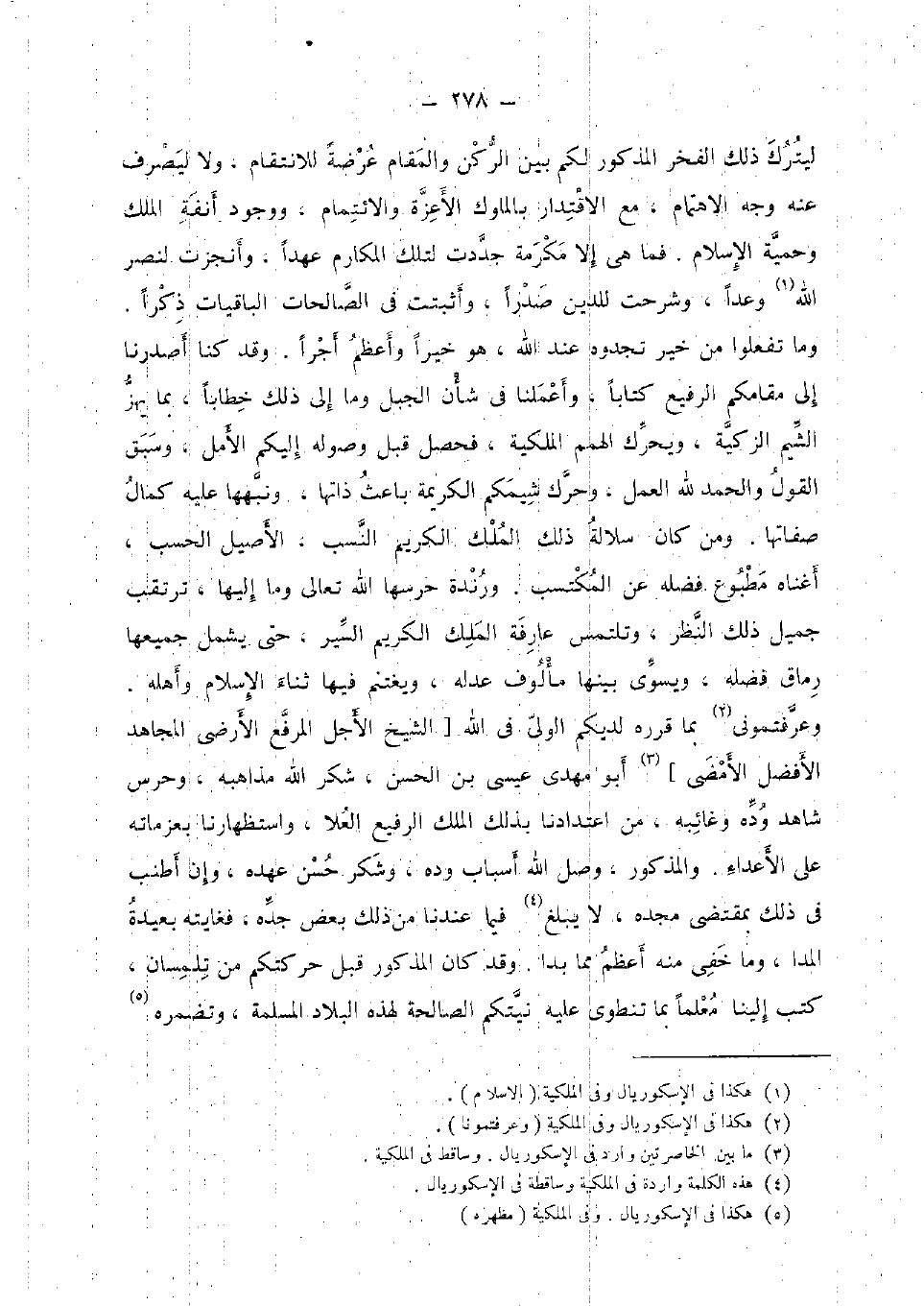 ليترك ذَلِك الْفَخر الْمَذْكُور لكم بَين الرُّكْن وَالْمقَام عرضة للانتقام، وَلَا ليصرف عَنهُ وَجه الاهتمام، مَعَ الاقتدار بالملوك الأعزة والإئتمام، وَوُجُود أَنَفَة الْملك وحمية الْإِسْلَام. فَمَا هِيَ إِلَّا مكرمَة جددت لتِلْك المكارم عهدا، وأنجزت لنصر الله وَعدا، وشرحت للدّين صَدرا، وأثبتت فِي الصَّالِحَات الْبَاقِيَات ذكرا. وَمَا تَفعلُوا من خير تَجِدُوهُ عِنْد الله، هُوَ خيرا وَأعظم أجرا. وَقد كُنَّا أصدرنا إِلَى مقامكم الرفيع كتابا، وأعملنا فِي شَأْن الْجَبَل وَمَا إِلَى ذَلِك خطابا، بِمَا يهز الشيم الزكية، ويحرك الهمم الملكية، فَحصل فَبل وُصُوله إِلَيْكُم الأمل، وَسبق القَوْل وَالْحَمْد لله فِي الْعَمَل، وحرك شيمكم الْكَرِيمَة باعث ذَاتهَا، ونبهها عَلَيْهِ كَمَال صفاتها. وَمن كَانَ سلالة ذَلِك الْملك الْكَرِيم النّسَب، الْأَصِيل الْحسب، أغناه مطبوع فَضله عَن المكتسب ورندة حرسها الله تَعَالَى وَمَا إِلَيْهَا، ترتقب جميل ذَلِك النّظر، وتلتمس عارفة الْملك الْكَرِيم السّير، حَتَّى يَشْمَل جَمِيعهَا رماق فَضله، وَيُسَوِّي بَينهَا مألوف عدله، ويغتنم فِيهَا ثَنَاء الْإِسْلَام وَأَهله. وعرفتمونى بِمَا قَرَّرَهُ لديكم الْوَلِيّ فِي الله [الشَّيْخ الْأَجَل المرفع الأَرْض الْمُجَاهِد الْأَفْضَل الأمضى] أَبُو مهْدي عِيسَى بن الْحسن، شكر الله مذاهبه، وحرس شَاهد وده وغائبه، من اعتدادنا بذلك الْملك الرفيع الْعلَا، واستظهارنا بعزماته على الْأَعْدَاء. وَالْمَذْكُور، وصل الله أَسبَاب وده، وشكر حسن عَهده، وَإِن أطنب فِي ذَلِك بِمُقْتَضى مجده، لَا يبلغ فِيمَا عندنَا من ذَلِك بعض جده، فغايته بعيدَة المدا، وَمَا خَفِي مِنْهُ أعظم مِمَّا بدا. وَقد كَانَ الْمَذْكُور قبل حركتكم من تلمسان، كتب إِلَيْنَا معلما بِمَا تنطوي عَلَيْهِ نيتكم الصَّالِحَة لهَذِهِ الْبِلَاد الْمسلمَة، وتضمره،