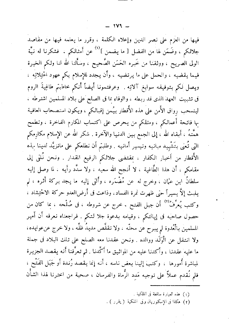 فِيهَا من الْعَزْم على نصر الدّين وإعلاه الْكَلِمَة، وَقرر مَا يُعلمهُ فِيهَا من مَقَاصِد جلالكم، وَضمن لَهَا من الْفضل [مَا يضمن] عَن أمثالكم، فشكرنا لَهُ نِيَّة الْوَلِيّ الصَّرِيح، ووثقنا من خَبره الْحسن الصَّحِيح، وَسَأَلنَا الله لنا وَلكم الْخيرَة فِيمَا يَقْضِيه، وَالْحمل على مَا يرتضيه، وَأَن يجدد لِلْإِسْلَامِ بكم عهود اعتلائه، ويصل لكم بتوفيقه سوابغ آلائه. وعرفتمونا أَيْضا أَنكُمْ خاطبتم طاغية الرّوم فِي تثبيت الْعَهْد الَّذِي قد ربطه، وَالْوَفَاء بِمَا فِي الصُّلْح على بِلَاد الْمُسلمين اشْتَرَطَهُ، لينسحب رواق الْأَمْن على هَذِه الأقطار بيمن إقبالكم، وَيكون اسْتِصْحَاب الْعَافِيَة بهَا فَاتِحَة أَعمالكُم، ومثلكم من يحرص على اكْتِسَاب المكارم الفاخرة. وتطمح همته، أبقاه الله، إِلَى الْجمع بَين الدُّنْيَا وَالْآخِرَة. شكر الله عَن الْإِسْلَام مكارمكم الَّتِي تعنى بتشييد مبانيه وتيسير أمانيه. وطلبتم أَن نطلعكم على مَا تزيد لدينا بِهَذِهِ الأقطار من أَخْبَار الْكفَّار، بِمُقْتَضى جلالكم الرفيع الْمِقْدَار. وَنحن نلقى إِلَى مقامكم، أَن هَذَا الطاغية، لَا أنجح الله سَعْيه، وَلَا سدد رَأْيه، لما وصل إِلَيْهِ سُلْطَان ابْن عُثْمَان، وَخرج لَهُ عَن مضمره، وَألقى إِلَيْهِ مَا يجد بركَة أَثَره، لم يلبث إِلَّا يَسِيرا حَتَّى ظَهرت ثَمَرَة الْفساد، وذاعت فِي أَرض الْعَدو حَرَكَة الاحتشاد، وَكتب يعرف أَن جبل الْفَتْح، خرج عَن شُرُوطه، فِي صلحه، بِمَا كَانَ من حُصُول صَاحبه فِي إيالتكم، وقيامه بدعوة جلالتكم. فراجعناه نعرفه أَن أَمِير الْمُسلمين بالعدوة لم يبرح عَن مَحَله، وَلَا تقلص مديد ظله، وَلَا خرج عَن عوايده، وَلَا انْتقل عَن الْوَلَد ووالده. وَنحن عَقدنَا مَعَه الصُّلْح على تِلْكَ الْبِلَاد فِي جملَة مَا عَلَيْهِ عَقدنَا، وأكدنا عَلَيْهِ من المواثيق مَا أكدنا. ثمَّ تعرفنا أَنه يقْصد الجزيرة لمباشرة أمورها، وَكتب إِلَيْنَا بعض ناسه، أَنه إِنَّمَا يقْصد رندة أَو جبل الْفَتْح، فَلم نقدم عملا على تَوْجِيه مدد الرُّمَاة والفرسان، صُحْبَة من اخترنا لهَذَا الشَّأْن