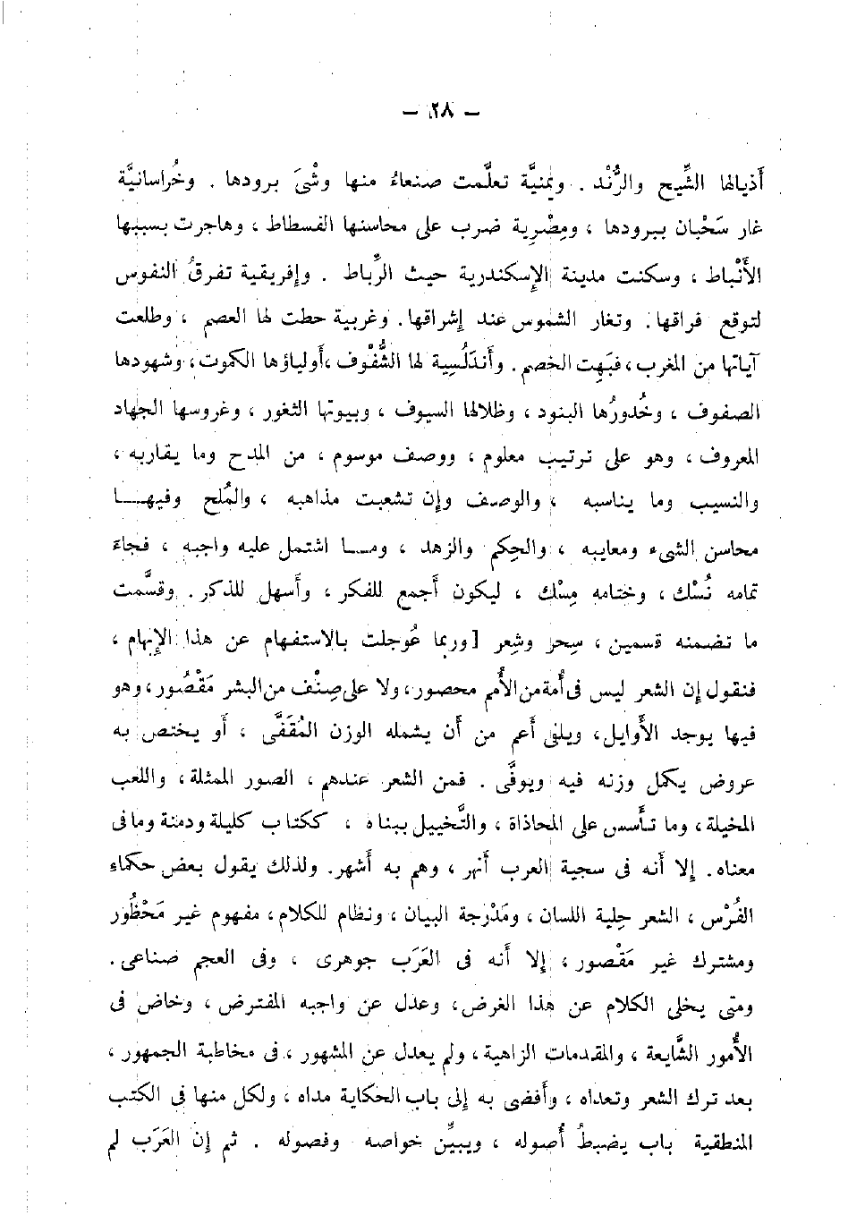 أذيالها الشيح والرند. ويمنية تعلمت صنعاء مِنْهَا وشى برودها. وخراسانية غَار سحبان ببرودها، ومصرية ضرب على محاسنها الْفسْطَاط، وَهَاجَرت بِسَبَبِهَا الأنباط، وسكنت مَدِينَة الْإسْكَنْدَريَّة حَيْثُ الرِّبَاط. وإفريقية تفرق النُّفُوس لتوقع فراقها. وتغار الشموس عِنْد إشراقها. وغربية حطت لَهَا العصم، وطلعت آياتها من الْمغرب، فبهت الْخصم. وأندلسية لَهَا الشفوف، أولياؤها الكموت، وشهودها الصُّفُوف، وخدورها البنود، وظلالها السيوف، وبيوتها الثغور، وغروسها الْجِهَاد الْمَعْرُوف وَهُوَ على تَرْتِيب مَعْلُوم، وَوصف مَوْسُوم، من الْمَدْح وَمَا يُقَارِبه، والنسيب وَمَا يُنَاسِبه، وَالْوَصْف وَإِن تشعبت مذاهبه، وَالْملح وفيهَا محَاسِن الشَّيْء ومعايبه، وَالْحكم والزهد، وَمَا اشْتَمَل عَلَيْهِ واجبه، فجَاء تَمَامه نسك، وختامه مسك، ليَكُون أجمع للفكر، وأسهل للذّكر. وَقسمت مَا تضمنه قسمَيْنِ، سحر وَشعر [وَرُبمَا عوجلت بالاستفهام عَن هَذَا الْإِبْهَام، فَنَقُول إِن الشّعْر لَيْسَ فِي أمة من الْأُمَم مَحْصُور، وَلَا على صنف من الْبشر مَقْصُور، وَهُوَ فِيهَا يُوجد الأوايل، ويلفي أَعم من أَن يَشْمَلهُ الْوَزْن المقفى، أَو يخْتَص بِهِ عرُوض يكمل وَزنه فِيهِ ويوفى. فَمن الشّعْر عِنْدهم، الصُّور الممثلة، واللعب المخيلة، وَمَا تأسس على الْمُحَاذَاة، والتخييل ببناه، ككتاب كليلة ودمنة وَمَا فِي مَعْنَاهُ. إِلَّا أَنه فِي سجية الْعَرَب أنهر، وهم بِهِ أشهر. وَلذَلِك يَقُول بعض حكماء الْفرس، الشّعْر حلية اللِّسَان، ومدرجة الْبَيَان، ونظام للْكَلَام، مَفْهُوم غير مَحْظُور ومشترك غير مَقْصُور، إِلَّا أَنه فِي الْعَرَب جوهري، وَفِي الْعَجم صناعي. وَمَتى يخلى الْكَلَام عَن هَذَا الْغَرَض، وَعدل عَن واجبه المفترض، وخاض فِي الْأُمُور الشايعة، والمقدمات الزاهية، وَلم يعدل عَن الْمَشْهُور، فِي مُخَاطبَة الْجُمْهُور، بعد ترك الشّعْر وتعداه، وأفضى بِهِ إِلَى بَاب الْحِكَايَة مداه، وَلكُل مِنْهَا فِي الْكتب المنطقية بَاب يضْبط أُصُوله وَيبين خواصه وفصوله. ثمَّ إِن الْعَرَب لم