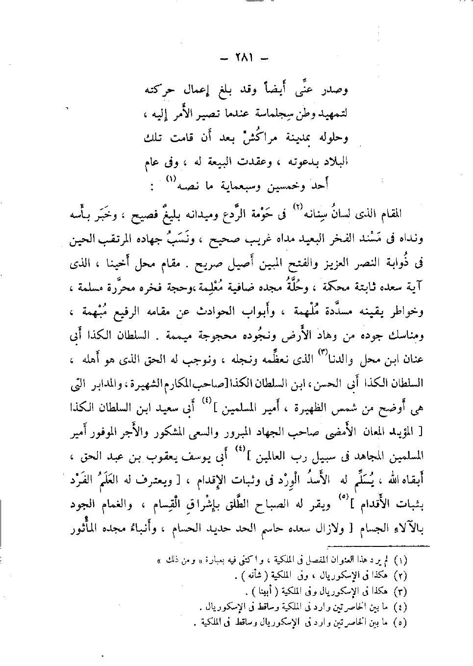 الْمقَام الَّذِي لِسَان سنانه فِي حومة الردع وميدانه بليغ فصيح، وَخبر بأسه ونداه فِي مُسْند الْفَخر الْبعيد مداه غَرِيب صَحِيح، وَنسب جهاده المرتقب الْحِين فِي ذوابة النَّصْر الْعَزِيز وَالْفَتْح الْمُبين أصيل صَرِيح. مقَام مَحل أخينا، الَّذِي آيَة سعده ثَابِتَة محكمَة، وحلة مجده ضافية معلمة، وَحجَّة فخره محررة مسلمة، وخواطر يقينه مسددة ملهمة، وأبواب الْحَوَادِث عَن مقَامه الرفيع مُبْهمَة، ومناسك جوده من وهاد الأَرْض ونجوده محجوجة ميممة. السُّلْطَان الكذا أبي عنان ابْن مَحل والدنا الَّذِي نعظمه ونجله، ونوجب لَهُ الْحق الَّذِي هُوَ أَهله، السُّلْطَان الكذا أبي الْحسن، ابْن السُّلْطَان الكذا [صَاحب المكارم الشهيرة، والمدابر الَّتِي هِيَ أوضح من شمس الظهيرة، أَمِير الْمُسلمين] أبي سعيد ابْن السُّلْطَان الكذا [الْمُؤَيد المعان الأمضى صَاحب الْجِهَاد المبرور وَالسَّعْي المشكور وَالْأَجْر الموفور أَمِير الْمُسلمين الْمُجَاهِد فِي سَبِيل رب الْعَالمين] أَي يُوسُف يَعْقُوب بن عبد الْحق، أبقاه الله، يسلم لَهُ الْأسد الْورْد فِي وثبات الْإِقْدَام، [ويعترف لَهُ الْعلم الْفَرد بثبات الْأَقْدَام] ويقر لَهُ الصَّباح الطلق بإشراق القسام، والغمام الْجُود بالآلاء الجسام [وَلَا زَالَ سعده حاسم الْحَد حَدِيد الحسام، وأنباء مجده الْمَأْثُور
