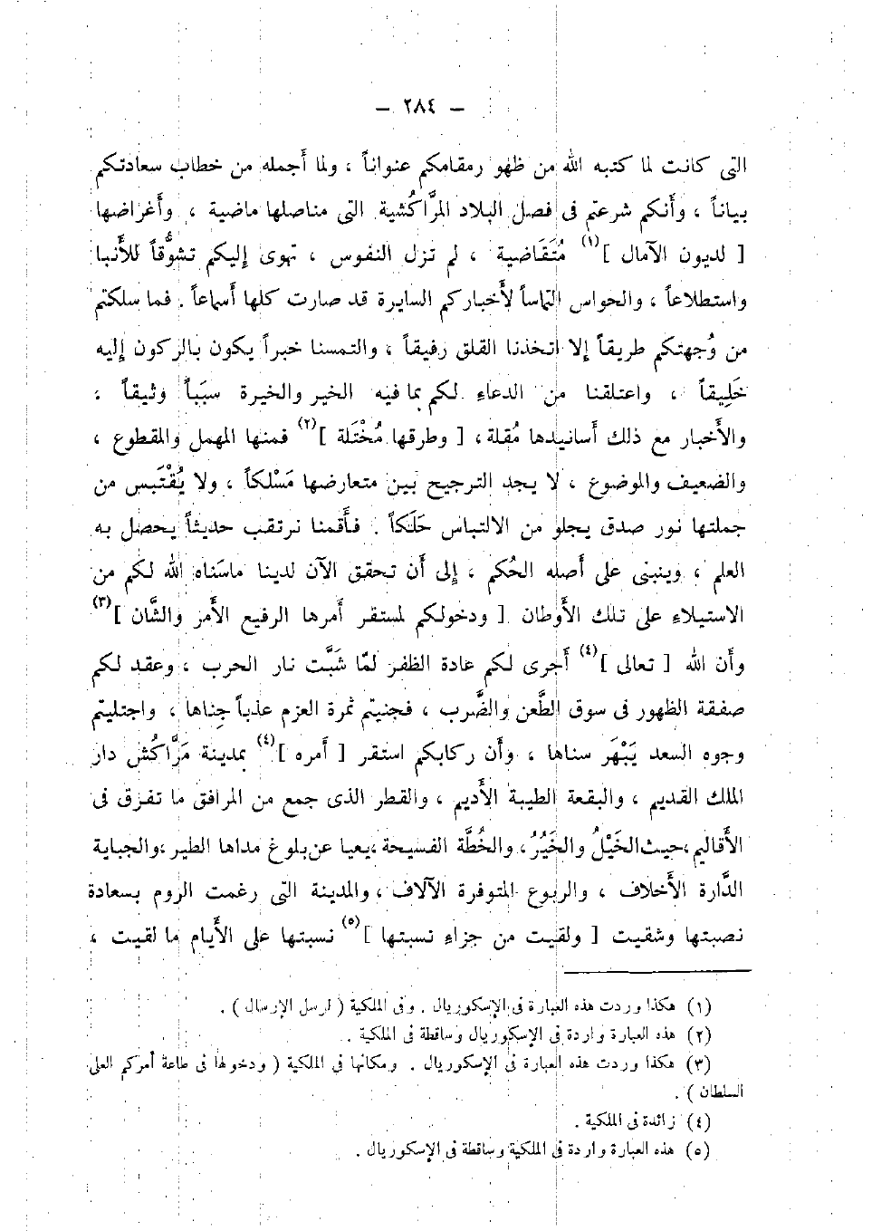 الَّتِي كَانَت لما كتبه الله من ظُهُور مقامكم عنوانا، وَلما أجمله من خطاب سعادتكم بَيَانا، وأنكم شرعتم فِي فصل الْبِلَاد المراكشية الَّتِي مناصلها مَاضِيَة، وأغراضها [لديون الآمال] متقاضية، لم تزل النُّفُوس، تهوى إِلَيْكُم تشوقا للأنبا واستطلاعا، والحواس التماسا لأخباركم السايرة قد صَارَت كلهَا أسماعا. فَمَا سلكتم من وجهتكم طَرِيقا إِلَّا اتخذنا القلق رَفِيقًا، والتمسنا خَبرا يكون بالركون إِلَيْهِ خليقا، واعتلفنا من الدُّعَاء لكم بِمَا فِيهِ الْخَيْر والخيرة سَببا وثيقا، وَالْأَخْبَار مَعَ ذَلِك أسانيدها مقلة، [وطرقها مختلة] فَمِنْهَا المهمل والمقطوع، والضعيف والموضوع، لَا يجد التَّرْجِيح بَين متعارضها مسلكا، وَلَا يقتبس من جُمْلَتهَا نور صدق يجلو من الالتباس حلكا. فَأَقَمْنَا نرتقب حَدِيثا يحصل بِهِ الْعلم، وَيَنْبَنِي على أَصله الحكم، إِلَى أَن تحقق الْآن لدينا مَا سناه الله لكم من الِاسْتِيلَاء على تِلْكَ الأوطان [ودخولكم لمستقر أمرهَا الرفيع الْأَمر والشان] وَأَن الله [تَعَالَى] أجْرى لكم عَادَة الظفر لما شبت نَار الْحَرْب، وَعقد لكم صَفْقَة الظُّهُور فِي سوق الطعْن وَالضَّرْب، فجنيتم ثَمَرَة الْعَزْم عذَابا جناها، واجتليتم وُجُوه السعد يبهر سناها، وَأَن ركابكم اسْتَقر [أمره] بِمَدِينَة مراكش دَار الْملك الْقَدِيم، والبقعة الطّيبَة الْأَدِيم، والقطر الَّذِي جمع من الْمرَافِق مَا تفرق فِي الأقاليم، حَيْثُ الْخَيل وَالْخَيْر، والخطة الفسيحة، يعيا عَن بُلُوغ مداها الطير، والجباية الدارة الأخلاف، والربوع المتوفرة الآلاف، وَالْمَدينَة الَّتِي رغمت الرّوم بسعادة نصبتها وشقيت [وَلَقِيت من جَزَاء نسبتها] نسبتها على الْأَيَّام مَا لقِيت،