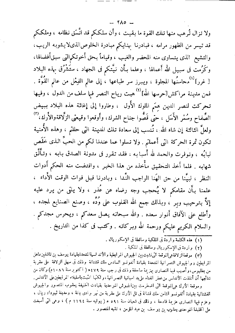 وَلَا تزَال ترهب مِنْهَا تِلْكَ الْقُوَّة مَا بقيت، وَأَن سلككم قد اتسق نظامه، وملككم قد تيَسّر من الظُّهُور مرامه، فبادرنا بهنايكم مبادرة الخلوص الَّذِي لَا يشوبه الريب، والتشيع الَّذِي يتساوى مِنْهُ الْمحْضر والغيب، وقياما بِحَق أخوتكم الَّتِي سبق أفضالها، وكرمت فِي سَبِيل الله أَعمالهَا، وعلما بِأَن نيتكم فِي الْجِهَاد، ستشرق بِهَذِهِ الْبِلَاد [غرر] محاسنها المجلوة، ويبرز سر طباعها، إِلَى عَالم الْفِعْل من عَالم الْقُوَّة. فَمن مَدِينَة مراكش [حرسها الله] هبت ريَاح النَّصْر فِيمَا سلف من الدول، وفيهَا تحركت لنصر الدّين همم الْمُلُوك الأول، وطاروا إِلَى إغاثة هَذِه الْبِلَاد ببيض الصفاح وَسمر الأسل، حَتَّى قصوا جنَاح الشّرك، وأوقعوا وقيعتي الزلاقة والأرك، وَلَعَلَّ الثَّالِثَة إِن شَاءَ الله، تنْسب إِلَى سَعَادَة تِلْكَ الْمَدِينَة الَّتِي حللتم، وَهَذِه الأمنية تكون ثَمَرَة الْحَرَكَة الَّتِي أعملتم. وَلَا تسلوا عَمَّا عندنَا لكم من الْحبّ الَّذِي خلص لبابه، وتوفرت وَالْحَمْد لله أَسبَابه، فقد تقرر فِي مدونة الصدْق بَابه، وتألق شهابه. فَلَمَّا أَخذ التَّحْقِيق مأخذه من هَذَا الْخَبَر، واقتضت مِنْهُ الحكم أدوات النّظر، لبينا من حق الهنا الْوَاجِب الندا، وبادرنا قبل فَوَات الْوَقْت الْأَدَاء، علمنَا بِأَن مقامكم لَا يحجب وَجه رِضَاهُ عَن عذر، وَلَا يلقى من يرد عَلَيْهِ إِلَّا بترحيب وبر، وَبِذَلِك جمع الله الْقُلُوب على وده، وصنع الصنايع لمجده، واطلع على الْآفَاق أنوار سعده. وَالله سُبْحَانَهُ يصل سعدكم، ويحرس مجدكم. وَالسَّلَام الْكَرِيم عَلَيْكُم وَرَحْمَة الله وَبَرَكَاته. وَكتب فِي كَذَا من التَّارِيخ.