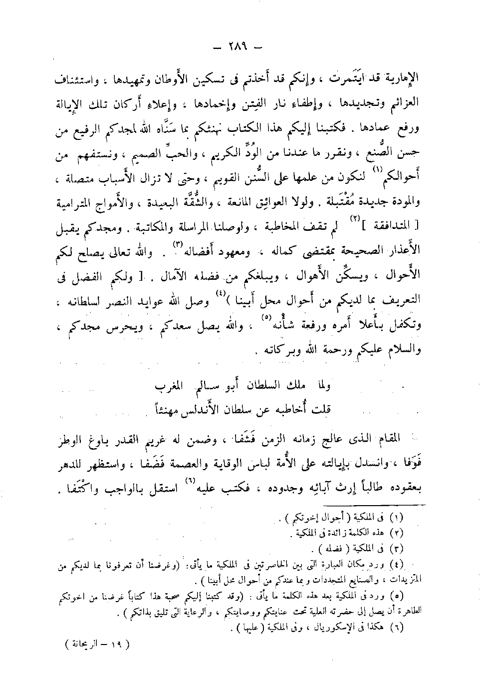 الإمارية قد ايتمرت، وَإِنَّكُمْ قد أَخَذْتُم فِي تسكين الأوطان وتمهيدها، واستئناف العزائم وتجديدها، وإطفاء نَار الْفِتَن وإخمادها وإعلاء أَرْكَان تِلْكَ الإيالة وَرفع عمادها، فكتبنا إِلَيْكُم هَذَا الْكتاب نهنئكم بِمَا سناه الله لمجدكم الرفيع من حسن الصنع، ونقرر مَا عندنَا من الود الْكَرِيم، وَالْحب الصميم، ونستفهم من أحوالكم لنكون من علمهَا على السّنَن القويم، وَحَتَّى لَا تزَال الْأَسْبَاب مُتَّصِلَة، والمودة جَدِيدَة مقتبلة. وَلَوْلَا الْعَوَائِق الْمَانِعَة، والشقة الْبَعِيدَة، والأمواج المترامية [المتدافقة] لم تقف المخاطبة، ولوصلنا المراسلة وَالْمُكَاتبَة. ومجدكم يقبل الْأَعْذَار الصَّحِيحَة بِمُقْتَضى كَمَاله، ومعهود أفضاله. وَالله تَعَالَى يصلح لكم الْأَحْوَال، ويسكن الْأَهْوَال، ويبلغكم من فَضله الآمال. [وَلكم الْفضل فِي التَّعْرِيف بِمَا لديكم من أَحْوَال مَحل أَبينَا) وصل الله عوايد النَّصْر لسلطانه، وتكفل بأعلا أمره ورفعة شَأْنه، وَالله يصل سعدكم، ويحرس مجدكم، وَالسَّلَام عَلَيْكُم وَرَحْمَة الله وَبَرَكَاته.