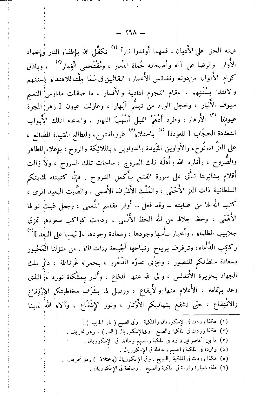 دينه الْحق الْأَدْيَان، فمهما أوقدوا نَارا تكفل الله بإطفاء النَّار وإخماد الأوار. وَالرِّضَا عَن آله وَأَصْحَابه حماة الذمار، ومقتحمي الغمار، وباذلى كرام الْأَمْوَال من دونه ونفائس الْأَعْمَار، القائمين فِي سما مِلَّته للاهتداء بسننهم والاقتدا بسننهم، مقَام النُّجُوم الهادية والأقمار، مَا صقلت مدارس النسيم سيوف الْأَنْهَار، وخجل الْورْد من تَبَسم البهار، وغازلت عُيُون [زهر المجرة عُيُون] الأزهار، وطرد أدهم اللَّيْل أَشهب النَّهَار، وَالدُّعَاء لتِلْك الْأَبْوَاب المتعددة الْحجاب [المعودة] باجتلاء غرر الْفتُوح، والمطالع المشيدة المصانع، على الْعِزّ الممنوح، والأواوين المؤيدة بالدواوين، بِالْمَلَائِكَةِ وَالروح، بإعلاء الْمظَاهر والصروح، وأناره الله بأهلة تِلْكَ السُّرُوج، ساحات تِلْكَ السُّرُوج، وَلَا زَالَت أَقْلَام بشائرها تَأتي على سُورَة الْفَتْح بأكمل الشُّرُوح. فَإنَّا كتبناه لمثابتكم السُّلْطَانِيَّة ذَات الْعِزّ الأحمى، وَالْملك الْأَشْرَف الأسمى، والصيت الْبعيد المرمى، كتب الله لَهَا من عنايته وَقد فعل أوفر مقاسم النعمى، وَجعل غيث نوالها الأهمى، وحظ جلالها من الله الْحَظ الأنمى، ودامت كواكب سعودها تمزق جلابيب الظلماء، وأخبار بأسها وجودهَا، وسعادة وجودهَا، [تهديها على الْبعد] ركائب الدأماء، وترفرف برياح ارتياحها أَجْنِحَة بَنَات المَاء. من منزلنا المحبور بسعادة سلطانكم الْمَنْصُور، وخزي عدوه المدحور، بِحَمْرَاء غرناطة، دَار ملك الْجِهَاد بِجَزِيرَة الأندلس، وَإِلَى الله عَنْهَا الدفاع، وأنار بمشكاة نوره، الَّذِي وعد بإتمامه، الْأَعْلَام مِنْهَا والإيفاع، وَوصل لَهَا بشرف مخاطبتكم الِارْتفَاع وَالِانْتِفَاع، حَتَّى تشفع بتهانيكم الأوتار، وَنور الإشفاع، وآلاء الله لدينا