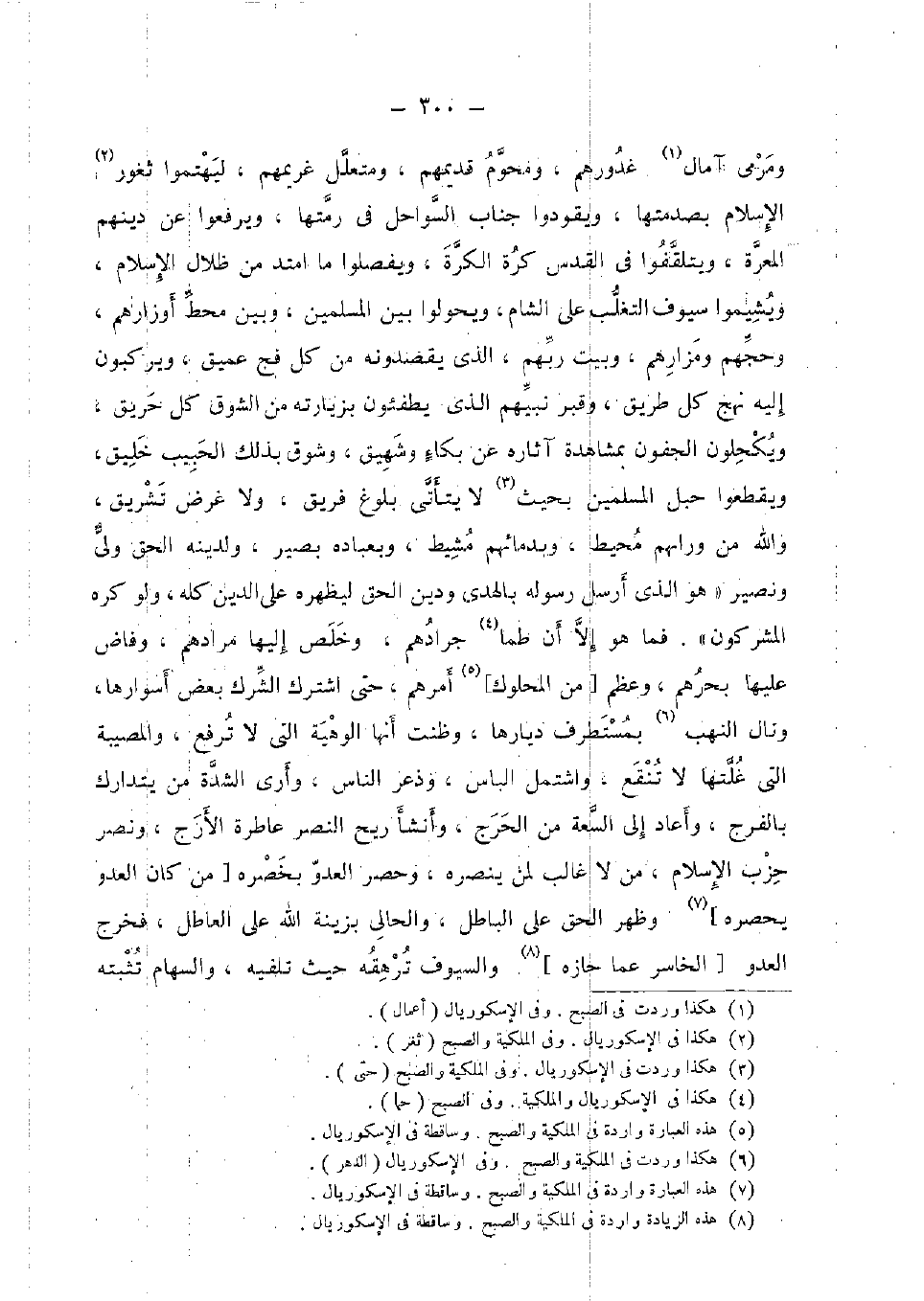 ومرمى آمال غدورهم، ومحوم قديمهم، ومتعلل غريمهم، ليهتموا ثغور الْإِسْلَام بصدمتها، ويقودوا جناب السواحل فِي رمتها، ويرفعوا عَن دينهم المعرة، ويتلقفوا فِي الْقُدس كرة الكرة، ويفصلوا مَا امْتَدَّ من ظلال الْإِسْلَام، ويشيموا سيوف التغلب على الشَّام، ويحولوا بَين الْمُسلمين، وَبَين محط أوزارهم، وحجهم ومزارهم، وَبَيت رَبهم، الَّذِي يقصدونه من كل فج عميق، ويركبون إِلَيْهِ نهج كل طَرِيق، وقبر نَبِيّهم الَّذِي يطفئون بزيارته من الشوق كل حريق، ويكحلون الجفون بمشاهدة آثاره عَن بكاء وشهيق، وشوق بذلك الحبيب خليق، ويقطعوا حَبل الْمُسلمين بِحَيْثُ لَا يَتَأَتَّى بُلُوغ فريق، وَلَا غَرَض تَشْرِيق، وَالله، من ورائهم مُحِيط، وبدمائهم مشيط، وبعباده بَصِير، ولدينه الْحق ولى ونصير " هُوَ الَّذِي أرسل رَسُوله بِالْهدى وَدين الْحق لِيظْهرهُ على الدّين كُله، وَلَو كره الْمُشْركُونَ ". فَمَا هُوَ إِلَّا أَن طما جرادهم، وخلص إِلَيْهَا مُرَادهم، وفاض عَلَيْهَا بحرهم، وَعظم [من المحلوك] أَمرهم، حَتَّى اشْترك الشّرك بعض أسوارها، ونال النهب بمستطرف ديارها، ظنت أَنَّهَا الوهية الَّتِي لَا ترفع، والمصيبة الَّتِي غَلَّتهَا لَا تنقع، واشتمل الباس، وذعر النَّاس، وَأرى الشدَّة من يتدارك بالفرج، وَأعَاد إِلَى السعَة من الْحَرج، وَأَنْشَأَ ريح النَّصْر عاطرة الأرج، وَنصر حزب الْإِسْلَام، من لَا غَالب لمن ينصره، وَحصر الْعَدو بخصره [من كَانَ الْعَدو يحصره] وَظهر الْحق على الْبَاطِل، والحالي بزينة الله على العاطل، فَخرج الْعَدو [الخاسر عَمَّا حازه] وَالسُّيُوف ترهقه حَيْثُ تلفيه، والسهام تثبته