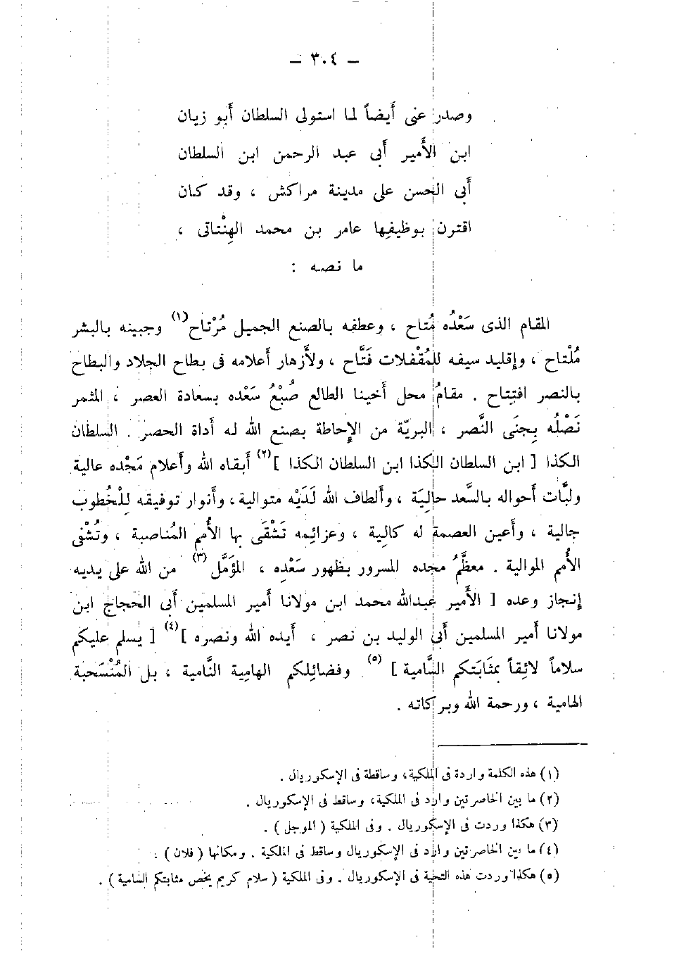 الْمقَام الَّذِي سعده متاح، وَعطفه بالصنع الْجَمِيل مرتاح وجبينه بالبشر ملتاح، وإقليد سَيْفه للمقفلات فتاح، ولأزهار أَعْلَامه فِي بطاح الجلاد والبطاح بالنصر افْتِتَاح. مقَام مَحل أخينا الطالع صبع سعده بسعادة الْعَصْر، المثمر نصله بجنى النَّصْر، الْبَريَّة من الْإِحَاطَة بصنع الله لَهُ أَدَاة الْحصْر. السُّلْطَان الكذا [ابْن السُّلْطَان الكذا ابْن السُّلْطَان الكذا] أبقاه الله وأعلام مجده عالية ولبات أَحْوَاله بالسعد حَالية، وألطاف الله لَدَيْهِ مُتَوَالِيَة، وأنوار توفيقه للخطوب جالية، وأعين الْعِصْمَة لَهُ كالية، وعزائمه تشقى بهَا الْأُمَم المناصبة، وتشفى الْأُمَم الموالية. مُعظم مجده المسرور بِظُهُور سعده، المؤمل من الله على يَدَيْهِ إنجاز وعده [الْأَمِير عبد الله مُحَمَّد ابْن مَوْلَانَا أَمِير الْمُسلمين أبي الْحجَّاج ابْن مَوْلَانَا أَمِير الْمُسلمين أبي الْوَلِيد بن نصر، أيده الله وَنَصره] [يسلم عَلَيْكُم سَلاما لائقا بمثابتكم السامية] وفضائلكم الهامية النامية، بل المنسحبة الهامية وَرَحْمَة الله وَبَرَكَاته