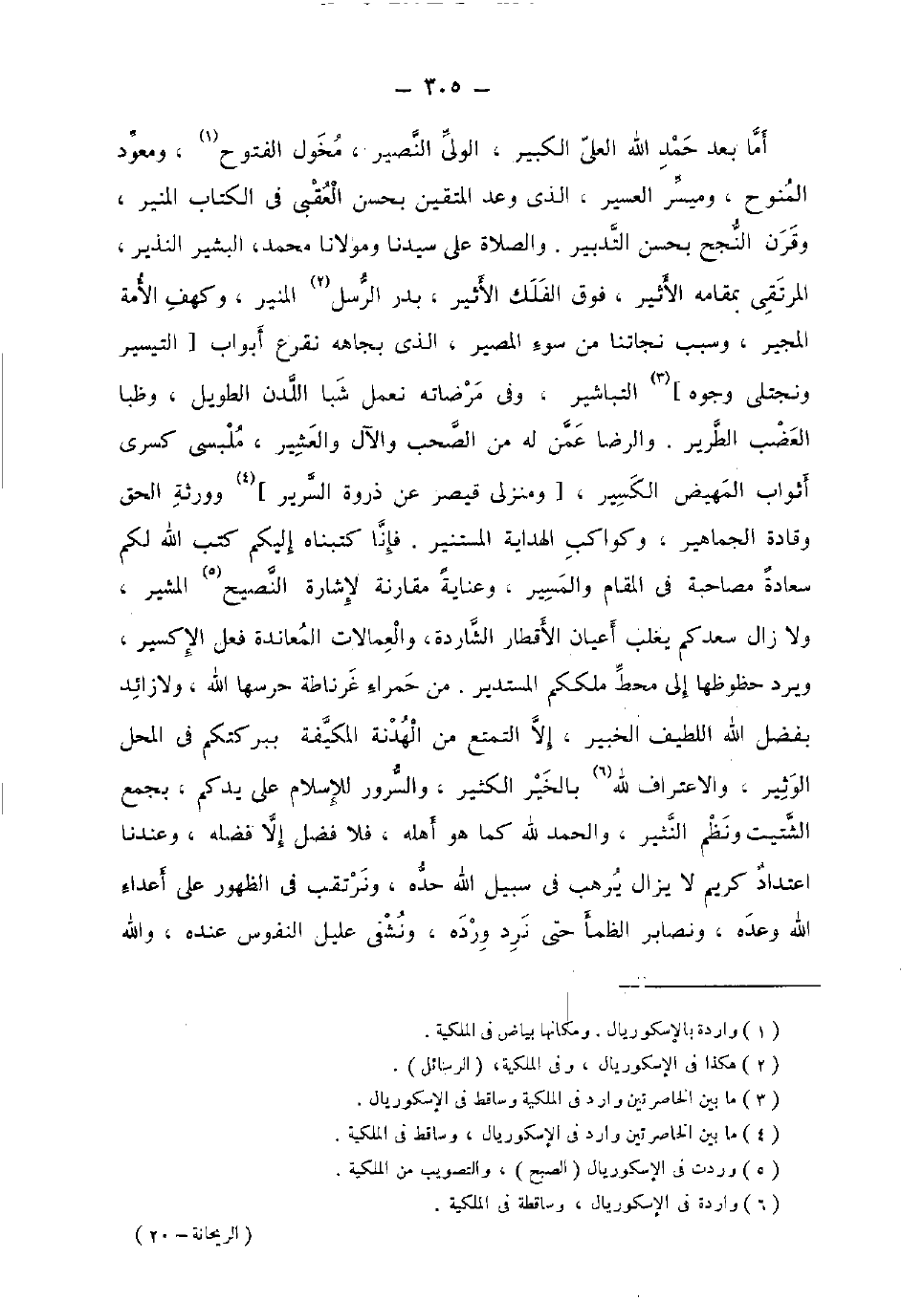 أما بعد حمد الله الْعلي الْكَبِير، الْوَلِيّ النصير، مخول الْفتُوح، ومعود المنوح، وميسر العسير، الَّذِي وعد الْمُتَّقِينَ بِحسن العقبى فِي الْكتاب الْمُنِير، وَقرن النجح بِحسن التَّدْبِير. وَالصَّلَاة على سيدنَا ومولانا مُحَمَّد، البشير النذير، المرتقى بمقامه الْأَثِير، فَوق الْفلك الْأَثِير، بدر الرُّسُل الْمُنِير، وكهف الْأمة المجير، وَسبب نجاتنا من سوء الْمصير، الَّذِي بجاهه نقرع أَبْوَاب [التَّيْسِير ونجتلي وُجُوه] التباشير، وَفِي مرضاته نعمل شبا اللدن الطَّوِيل، وظبا العضب الطرير. وَالرِّضَا عَمَّن لَهُ من الصحب والآل والعشير، ملبسى كسْرَى أَثوَاب المهيض الكسير، [ومنزلي قَيْصر عَن ذرْوَة السرير] وورثة الْحق وقادة الجماهير، وكواكب الْهِدَايَة المستنير. فَإنَّا كتبناه إِلَيْكُم كتب الله لكم سَعَادَة مصاحبة فِي الْمقَام والمسير، وعناية مُقَارنَة لإشارة النصيح المشير، وَلَا زَالَ سعدكم يغلب أَعْيَان الأقطار الشاردة، والعمالات المعاندة فعل الإكسير، وَيرد حظوظها إِلَى محط ملككم المستدير. من حَمْرَاء غرناطة حرسها الله، وَلَا زَائِد بِفضل الله اللَّطِيف الْخَبِير، إِلَّا التَّمَتُّع من الْهُدْنَة المكيفة ببركتكم فِي الْمحل الوثير، وَالِاعْتِرَاف لله بِالْخَيرِ الْكثير، وَالسُّرُور لِلْإِسْلَامِ على يدكم، بِجمع الشتيت ونظم النثير، وَالْحَمْد لله كَمَا هُوَ أَهله، فَلَا فضل إِلَّا فَضله، وَعِنْدنَا اعْتِدَاد كريم لَا يزَال يرهب فِي سَبِيل الله حَده، ونرتقب فِي الظُّهُور على أَعدَاء الله وعده، ونصابر الظمأ حَتَّى نرد ورده، ونشفى عليل النُّفُوس عِنْده، وَالله