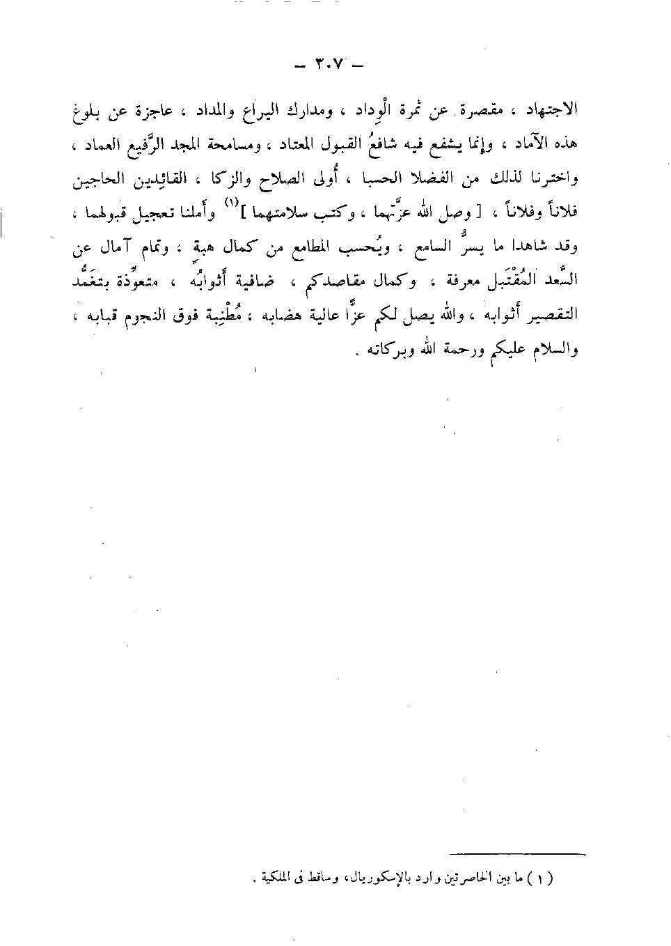 الِاجْتِهَاد، مقصرة عَن ثَمَرَة الوداد، ومدارك اليراع والمداد، عاجزة عَن بُلُوغ هَذِه الآماد، وَإِنَّمَا يشفع فِيهِ شَافِع الْقبُول الْمُعْتَاد، ومسامحة الْمجد الرفيع الْعِمَاد، واخترنا لذَلِك من الفضلا الحسبا، أولى الصّلاح والزكا، القائدين الحاجين فلَانا وَفُلَانًا، [وصل الله عزتهما، وَكتب سلامتهما] وأملنا تَعْجِيل قبولهما، وَقد شَاهدا مَا يسر السَّامع، ويحسب المطامع من كَمَال هبة، وَتَمام آمال عَن السعد المقتبل معرفَة، وَكَمَال مقاصدكم، ضافية أثوابه، متعوذة بتغمد التَّقْصِير أثوابه، وَالله يصل لكم عزا عالية هضابه، مطنبة فَوق النُّجُوم قبابه، وَالسَّلَام عَلَيْكُم وَرَحْمَة الله وَبَرَكَاته.