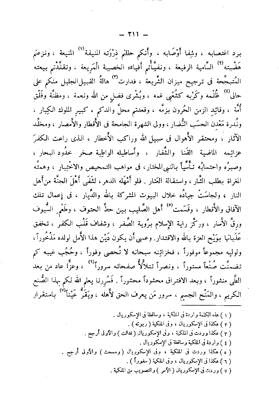برد اغتصابه، وشفا أوصابه، وأنكم حللتم ذروته المنيفة المنيعة، ونزعتم هضبته السامية الرفيعة، ونفيأتم أفياءه الخصيبة المريعة، وتقلدتم بيعَته المتبجحة فِي تَرْجِيح ميزَان الشَّرِيعَة، فدارت هَالة الْقَبِيل الْجَلِيل مِنْكُم على حَالي ظلمه وكربه كشعبي غمه، وبشرى فضل من الله ونعمة، ومظنة وفلق أمة، وقائد الزَّمن الحرون بزمه، وقعدتم مَحل والدكم، كَبِير الْمُلُوك الْكِبَار، وندرة مَعْدن الْحسب النضار، وَولى الشُّهْرَة الجامحة فِي الأقطار والأمصار، ومخلد الْآثَار، ومحتقر الْأَهْوَال فِي سَبِيل الله وراكب الأخطار، الَّذِي راعت الْكفْر عَزَائِمه الْمَاضِيَة القنا والشفار، وأساطيله الواطية صَخْر خدود الْبحار، وَصَبره واحتسابه تأسيا بِالنَّبِيِّ الْمُخْتَار، فِي مواهب التمحيص وَالِاخْتِيَار، وهمته المغراة بِطَلَب بالثار، واستقالة العثار. فَلَو أمهله الدَّهْر، لشفى أهل الْجنَّة من أهل النَّار، ولجاست جياده خلال الْبيُوت المشركة بِاللَّه والديار، فِي إِعْمَال تِلْكَ الْآفَاق والأقطار، وَقسمت أهل الصَّلِيب بَين حط الحتوف، وَطعم السيوف ورق الأسار، وركز راية الْإِسْلَام بدويه الصفر، وشفاف قلب الْكفْر، تخفق عذباتها بويح الْعِزَّة بِاللَّه والاقتدار. وَعَسَى أَن يكون دين هَذَا الأمل لوَلَده مذخورا، ولوليه مجموعا موفورا، فخزائنه سُبْحَانَهُ لَا تحصى وفورا، وحجب غيبه كم تَضَمَّنت صنعا مَسْتُورا، ونصرا تتلألأ صفحاته سُرُورًا، وَعزا عَاد من بعد الطي منشورا، وَبعد الِافْتِرَاق محشودا محشورا. فَسُرِرْنَا يعلم الله لكم بِهَذَا الصنع الْكَرِيم، والمنح الجسيم، سرُور من يعرف الْحق لأَهله، ويقر عينا باستقرار