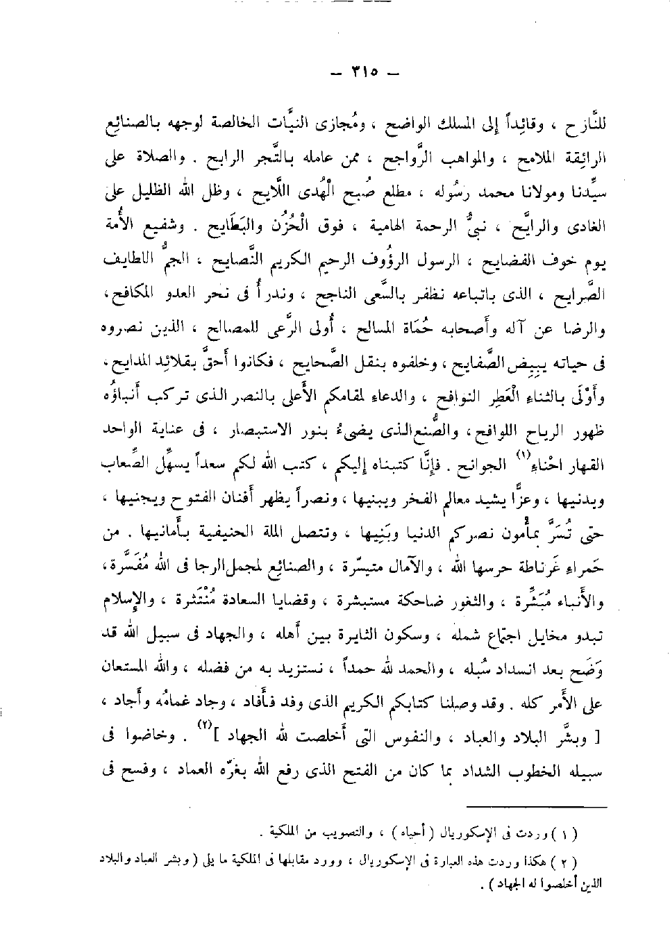 للنازح، وَقَائِدًا إِلَى المسلك الْوَاضِح، ومجازي النيات الْخَالِصَة لوجهه بالصنائع الرائفة الملامح، والمواهب الرواجح، مِمَّن عَامله بالتجر الرابح، وَالصَّلَاة على سيدنَا ومولانا مُحَمَّد رَسُوله، مطلع صبح الْهدى اللايح، وظل الله الظليل على الغادي والرايح، نَبِي الرَّحْمَة الهامية، فَوق الْحزن والبطايح. وشفيع الْأمة يَوْم خوف الفضايح، الرَّسُول الرؤوف الرَّحِيم الْكَرِيم النصايح، الجم اللطايف الصرايح، الَّذِي باتباعه نظفر بالسعى الناجح، وندرأ فِي نحر الْعَدو المكافح، وَالرِّضَا عَن آله وَأَصْحَابه حماة المسالح، أولى الرعى للْمصَالح، الَّذين نصروه فِي حَيَاته يبيض الصفايح، وخلفوه بِنَقْل الصحايح، فَكَانُوا أَحَق بقلائد المدايح، وَأولى بالثناء الْعطر النوافح، وَالدُّعَاء لمقامكم الْأَعْلَى بالنصر الَّذِي تركب أنباؤه ظُهُور الرِّيَاح اللوافح، والصنع الَّذِي يضيء بِنور الاستبصار، فِي عناية الْوَاحِد القهار احناء الجوانح. فَإنَّا كتبناه إِلَيْكُم، كتب الله لكم سَعْدا يسهل الصعاب ويدنيها، وَعزا يشيد معالم الْفَخر ويبنيها، ونصرا يظْهر أفنان الْفتُوح ويجنيها، حَتَّى تسر بمأمون نصركم الدُّنْيَا وبنيها، وتتصل الْملَّة الحنيفية بأمانيها. من حَمْرَاء غرناطة حرسها الله، والآمال متيسرة، والصنائع لمجمل الرجا فِي الله مفسرة، والأنباء مبشرة، والثغور ضاحكة مستبشرة، وقضايا السَّعَادَة منتشرة، وَالْإِسْلَام تبدو مخايل اجْتِمَاع شَمله، وَسُكُون الثايرة بَين أَهله، وَالْجهَاد فِي سَبِيل الله قد وضح بعد انسداد سبله، وَالْحَمْد لله حمدا، نستزيد بِهِ من فَضله، وَالله الْمُسْتَعَان على الْأَمر كُله. وَقد وصلنا كتابكُمْ الْكَرِيم الَّذِي وَفد فَأفَاد، وجاد غمامه وأجاد، [وَبشر الْبِلَاد والعباد، والنفوس الَّتِي أخلصت لله الْجِهَاد] . وخاضوا فِي سَبيله الخطوب الشداد بِمَا كَانَ من الْفَتْح الَّذِي رفع الله بغره الْعِمَاد، وفسح فِي