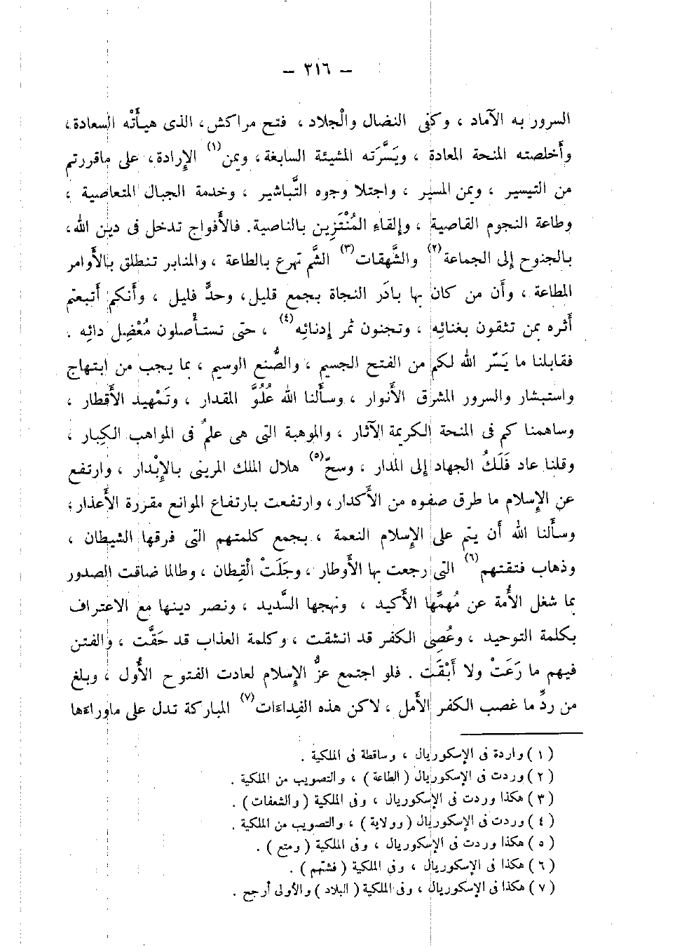 السرُور بِهِ الآماد، وَكفى النضال والجلاد، فتح مراكش، الَّذِي هيأته السَّعَادَة، وأخلصته المنحة الْمُعَادَة، ويسرته الْمَشِيئَة السابغة، ويمن الْإِرَادَة، على مَا قررتم من التَّيْسِير، ويمن الْمسير، واجتلا وُجُوه التباشير، وخدمة الْجبَال المتعاصية، وَطَاعَة النُّجُوم القاصية، وإلقاء المنتزين بالناصية. فالأفواج تدخل فِي دين الله، بالجنوح إِلَى الْجَمَاعَة والشهقات الشم تهرع بِالطَّاعَةِ، والمنابر تَنْطَلِق بالأوامر المطاعة، وَأَن من كَانَ بهَا بَادر النجَاة بِجمع قَلِيل، وحد فليل، وأنكم أتبعتم أَثَره بِمن تثقون بغنائه، وتجنون ثَمَر إدنائه، حَتَّى تستأصلون معضل دائه. فقابلنا مَا يسر الله لكم من الْفَتْح الجسيم، والصنع الوسيم، بِمَا يجب من ابتهاج واستبشار وَالسُّرُور الْمشرق الْأَنْوَار، وَسَأَلنَا الله علو الْمِقْدَار، وتمهيد الأقطار، وساهمنا كم فِي المنحة الْكَرِيمَة الْآثَار، والموهبة الَّتِي هِيَ علم فِي الْمَوَاهِب الْكِبَار، وَقُلْنَا عَاد فلك الْجِهَاد إِلَى الْمدَار، وسح هِلَال الْملك المريني بالإبدار، وارتفع عَن الْإِسْلَام مَا طرق صَفوه من الأكدار، وَارْتَفَعت بارتفاع الْمَوَانِع مقررة الْأَعْذَار، وَسَأَلنَا الله أَن يتم على الْإِسْلَام النِّعْمَة، بِجمع كلمتهم الَّتِي فرقها الشَّيْطَان، وَذَهَاب فتقتهم الَّتِي رجعت بهَا الأوطار، وجلت الْقطَّان، وطالما ضَاقَتْ الصُّدُور بِمَا شغل الْأمة عَن مهمها الأكيد، ونهجها السديد، وَنصر دينهَا مَعَ الِاعْتِرَاف بِكَلِمَة التَّوْحِيد، وَعصى الْكفْر قد انشقت، وَكلمَة الْعَذَاب قد حقت، والفتن فيهم مَا رعت وَلَا أبقت. فَلَو اجْتمع عز الْإِسْلَام لعادت الْفتُوح الأول، وَبلغ من رد مَا غصب الْكفْر الأمل، لَا كن هَذِه الفداءات الْمُبَارَكَة تدل على مَا وَرَاءَهَا