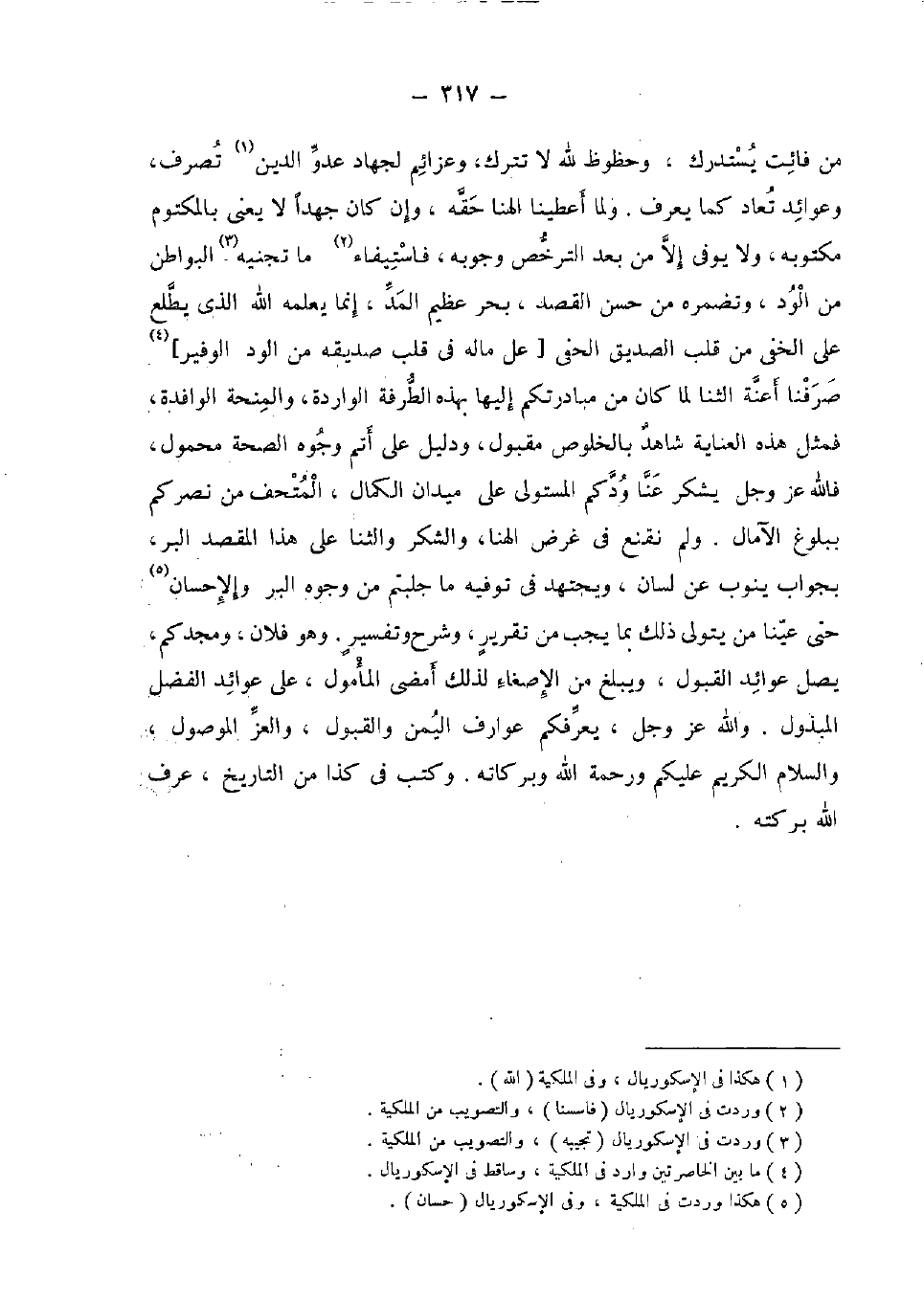 من فَائت يسْتَدرك، وحظوظ لله لَا تتْرك، وعزائم لجهاد عَدو الدّين تصرف، وعوائد تُعَاد كَمَا يعرف. وَلما أعطينا الهنا حَقه، وَإِن كَانَ جهدا لَا يَعْنِي بالمكتوم مكتوبه، وَلَا يُوفي إِلَّا من بعد التَّرَخُّص وُجُوبه، فاستيفاء مَا تجنيه البواطن من الود، وتضمره من حسن الْقَصْد، بَحر عَظِيم الْمَدّ، إِنَّمَا يُعلمهُ الله الَّذِي يطلع على الْخَفي من قلب الصّديق الحفي [عل مَاله فِي قلب صديقه من الود الوفير] صرفنَا أَعِنَّة الثنا لما كَانَ من مبادرتكم إِلَيْهَا بِهَذِهِ الطرفة الْوَارِدَة، والمنحة الوافدة، فَمثل هَذِه الْعِنَايَة شَاهد بالخلوص مَقْبُول، وَدَلِيل على أتم وُجُوه الصِّحَّة مَحْمُول، فَالله عز وَجل يشْكر عَنَّا ودكم المستولي على ميدان الْكَمَال، المتحف من نصركم ببلوغ الآمال. وَلم نقنع فِي غَرَض الهنا، وَالشُّكْر والثنا على هَذَا الْمَقْصد الْبر، بِجَوَاب يَنُوب عَن لِسَان، ويجتهد فِي توفيه مَا جلبتم من وُجُوه الْبر وَالْإِحْسَان حَتَّى عينا من يتَوَلَّى ذَلِك بِمَا يجب من تَقْرِير، وَشرح وَتَفْسِير. وَهُوَ فلَان، ومجدكم، يصل عوائد الْقبُول، ويبلغ من الإصغاء لذَلِك أمضى المأمول، على عوائد الْفضل المبذول. وَالله عز وَجل، يعرفكم عوارف الْيمن وَالْقَبُول،، والعز الْمَوْصُول، وَالسَّلَام الْكَرِيم عَلَيْكُم وَرَحْمَة الله وَبَرَكَاته. وَكتب فِي كَذَا من التَّارِيخ، عرف الله بركته.