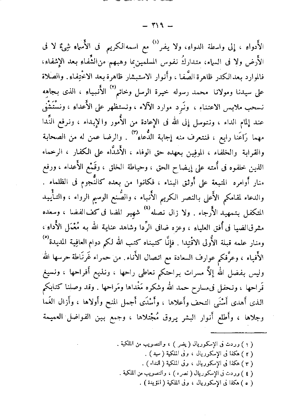 الأدواء، إِلَى وَاسِطَة الدَّوَاء وَلَا يفر مَعَ اسْمه الْكَرِيم فِي الْأَسْمَاء شَيْء لَا فِي الأَرْض وَلَا فِي السَّمَاء، متدارك نفوس الْمُسلمين بِمَا وهبهم من الشِّفَاء بعد الإشفاء، فالموارد بعد الكدر ظَاهِرَة الصَّفَا، وأنوار الاستبشار ظَاهِرَة بعد الاختفاء. وَالصَّلَاة على سيدنَا ومولانا مُحَمَّد رَسُوله خيرة الرُّسُل وَخَاتم الْأَنْبِيَاء، الَّذِي بجاهه نسحب ملابس الاعتناء، ونرد موارد الآلاء، ونستظهر على الْأَعْدَاء، ونستشفي عِنْد إِلْمَام الدَّاء، ونتوسل إِلَى الله فِي الْإِعَادَة من الْأُمُور والإبداء، ونرفع الندا مهما رَاعنا رايع فنتعرف مِنْهُ إِجَابَة الدُّعَاء. وَالرِّضَا عَمَّن لَهُ من الصَّحَابَة والقرابة وَالْخُلَفَاء، الْمُوفينَ بعهده حق الْوَفَاء، الْأَشِدَّاء على الْكفَّار، الرُّحَمَاء الَّذين خلفوه فِي أمته على إِيضَاح الْحق، وحياطة الْخلق، وقمع الْأَعْدَاء، وَرفع منار أوامره المتبعة على أوثق الْبناء، فَكَانُوا من بعده كَالنُّجُومِ فِي الظلماء. وَالدُّعَاء لمقامكم الْأَعْلَى بالنصر الْكَرِيم الأنباء، والصنع الوسيم الرواء، والتأييد المتكفل بتمهيد الأرجاء. وَلَا زَالَ نصله شهير المضا فِي كف الفضا، وسعده مشرق الضيا فِي أفق العلياء، وعزه ضافي الردا وَشَاهد عناية الله بِهِ معمل الْأَدَاء، ومنار علمه قبْلَة الأولى الاقتدا. فَإنَّا كتبناه كتب الله لكم دوَام الْعَافِيَة المديدة الأفياء، وعرفكم عوارف السَّعَادَة مَعَ اتِّصَال الأناء. من حَمْرَاء غرناطة حرسها الله وَلَيْسَ بِفضل الله إِلَّا مسرات براحتكم نعاطى راحها، ونذيع أفراحها، ونسيغ قراحها، ونحفل فِي مسارح حمد الله وشكره مغداها ومراحها. وَقد وصلنا كتابكُمْ الَّذِي أهْدى أَسْنَى التحف وأعلاها، وأسدى أجمل الْمنح وأولاها، وأزال الغما وجلاها، وأطلع أنوار الْبشر يروق مجتلاها، وَجمع بَين الفواضل العميمة