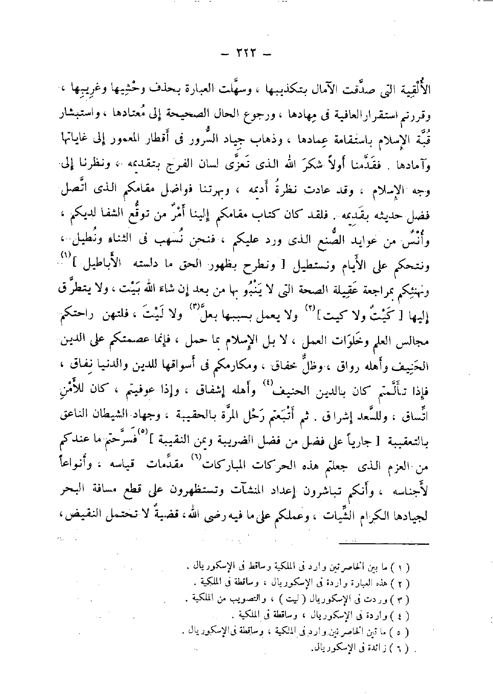 الألقية الَّتِي صدقت الآمال بتكذيبها، وسهلت الْعبارَة بِحَذْف وحشيها وغريبها، وقررتم اسْتِقْرَار الْعَافِيَة فِي مهادها، وَرُجُوع الْحَال الصَّحِيحَة إِلَى معتادها، واستبشار قبَّة الْإِسْلَام باستقامة عمادها، وَذَهَاب جِيَاد السرُور فِي أقطار الْمَعْمُور إِلَى غاياتها وآمادها. فقدمنا أَولا شكر الله الَّذِي تعزى لِسَان الْفرج بتقديمه، ونظرنا إِلَى وَجه الْإِسْلَام، وَقد عَادَتْ نظرة أديمه، وبهرتنا فواضل مقامكم الَّذِي اتَّصل فضل حَدِيثه بقديمه. فَلَقَد كَانَ كتاب مقامكم إِلَيْنَا أَمر من توقع الشفا لديكم، وَأنس من عوايد الصنع الَّذِي ورد عَلَيْكُم، فَنحْن نسهب فِي الثَّنَاء ونطيل، ونتحكم على الْأَيَّام ونستطيل [ونطرح بِظُهُور الْحق مَا دلسته الأباطيل] ونهنئكم بمراجعة عقيلة الصِّحَّة الَّتِي لَا ينبو بهَا من بعد إِن شَاءَ الله بَيت، وَلَا يتَطَرَّق إِلَيْهَا [كَيْت وَلَا كَيْت] وَلَا يعْمل بِسَبَبِهَا بعل وَلَا لَيْت، فلتهن راحتكم مجَالِس الْعلم وخلوات الْعَمَل، لَا بل الْإِسْلَام بِمَا حمل، فَإِنَّمَا عصمتكم على الدّين الحنيف وَأَهله رواق، وظل خفاق، ومكارمكم فِي أسواقها للدّين وَالدُّنْيَا نفاق، فَإِذا تألمتم كَانَ بِالدّينِ الحنيف وَأَهله إشفاق، وَإِذا عوفيتم، كَانَ للأمن اتساق، وللسعد إشراق. ثمَّ أتبعتم رَحل الْمرة بالحقيبة، وَجِهَاد الشَّيْطَان التاعق بالتعقيبة [جَارِيا على فضل من فضل الضريبة ويمن النقيبة] فسرحتم مَا عنْدكُمْ من الْعَزْم الَّذِي جعلتم هَذِه الحركات المباركات مُقَدمَات قِيَاسه، وأنواعا لأجناسه، وأنكم تباشرون إعداد الْمُنْشَآت وتستظهرون على قطع مَسَافَة الْبَحْر لجيادها الْكِرَام الشيات، وعملكم على مَا فِيهِ رضى الله، قَضِيَّة لَا تحْتَمل النقيض،