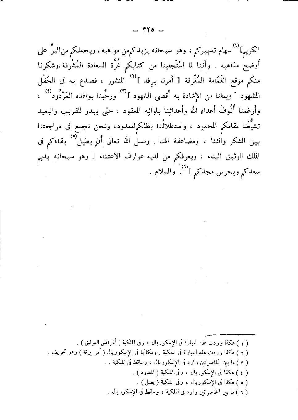 الْكَرِيم] سِهَام تدبيركم، وَهُوَ سُبْحَانَهُ يزيدكم من مواهبه، ويحملكم من الْبر على أوضح مذاهبه. وأننا لما استجلينا من كتابكُمْ غرَّة السَّعَادَة المشرقة، وشكرنا مِنْكُم موقع الغمامة المغرقة [أمرنَا برفد] المنشور، فصدع بِهِ فِي الحفل الْمَشْهُود [وبلغنا من الإشادة بِهِ أقْصَى الشُّهُود] ورحبنا بوافده الْمَرْدُود، وأرغمنا أنوف أَعدَاء الله وأعدائنا بلوائه الْمَعْقُود، حَتَّى يَبْدُو للقريب والبعيد تشيعنا لمقامكم الْمَحْمُود، واستظلالنا بظلكم الْمَمْدُود، وَنحن نجمع فِي مراجعتنا بَين الشُّكْر والثنا، ومضاعفة الهنا، ونسل الله تَعَالَى أَن يُطِيل بقاءكم فِي الْملك الوثيق الْبناء، ويعرفكم من لَدَيْهِ عوارف الاعتناء [وَهُوَ سُبْحَانَهُ يديم سعدكم ويحرس مجدكم] . وَالسَّلَام.