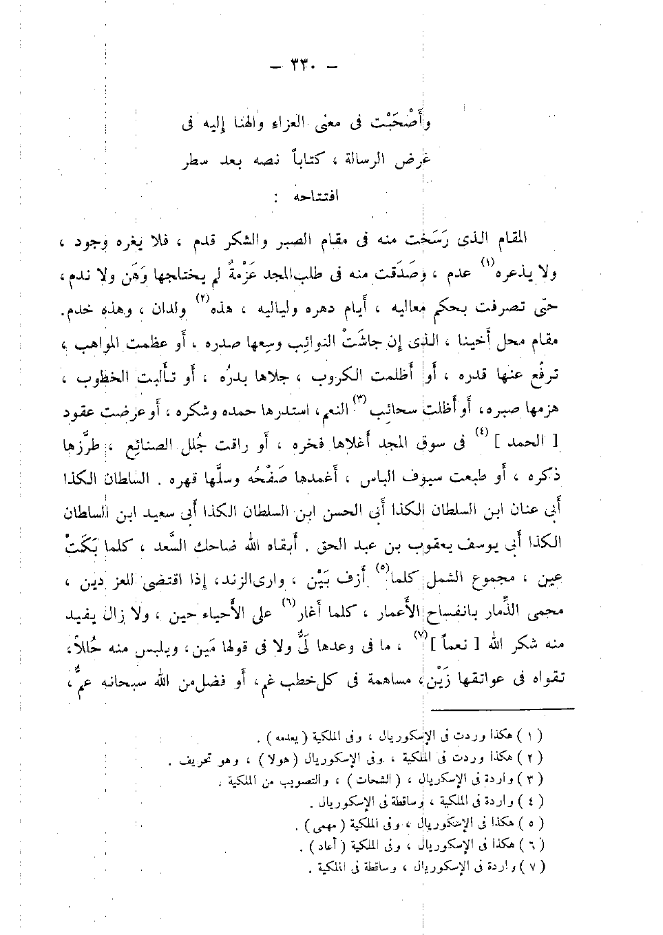 الْمقَام الَّذِي رسخت مِنْهُ فِي مقَام الصَّبْر وَالشُّكْر قدم، فَلَا يغره وجود، وَلَا يذعره عدم، وصدقت مِنْهُ فِي طلب الْمجد عَزمَة لم يختلجها وَهن وَلَا نَدم، حَتَّى تصرفت بِحكم معاليه، أَيَّام دهره ولياليه، هَذِه ولدان، وَهَذِه خدم. مقَام مَحل أخينا، الَّذِي إِن جَاشَتْ النوائب وسعهَا صَدره، أَو عظمت الْمَوَاهِب، ترفع عَنْهَا قدره، أَو أظلمت الكروب، جلاها بدره، أَو تألبت الخطوب، هزمها صبره، أَو أظلت سحائب النعم، استدرها حَمده وشكره، أَو عرضت عُقُود [الْحَمد] فِي سوق الْمجد أغلاها فخره، أَو راقت جلل الصَّنَائِع، طرزها ذكره، أَو طبعت سيوف الباس، أغمدها صفحه وسلها قهره. السُّلْطَان الكذا أبي عنان ابْن السُّلْطَان الكذا أبي الْحسن ابْن السُّلْطَان الكذا أبي سعيد ابْن السُّلْطَان الكذا أبي يُوسُف يَعْقُوب بن عبد الْحق. أبقاه الله ضَاحِك السعد، كلما بَكت عين،، مَجْمُوع الشمل كلما أزف بَين، وارى الزند، إِذا اقْتضى للعز دين، محمى الذمار بانفساح الْأَعْمَار، كلما أغار على الْأَحْيَاء حِين، وَلَا زَالَ يُفِيد مِنْهُ شكر الله [نعما] ، مَا فِي وعدها لي وَلَا فِي قَوْلهَا مين، ويلبس مِنْهُ حللا، تقواه فِي عواتقها زين، مساهمة فِي كل خطب غم، أَو فضل من الله سُبْحَانَهُ عَم،