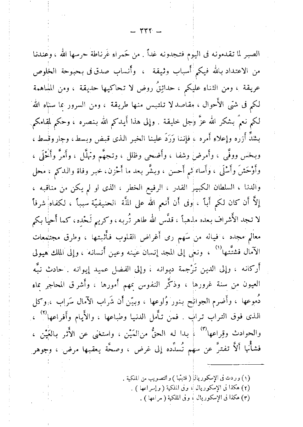 الصَّبْر لما تقدمونه فِي الْيَوْم فتجدونه غَدا. من حَمْرَاء غرناطة حرسها الله، وَعِنْدنَا من الِاعْتِدَاد بِاللَّه فِيكُم أَسبَاب وَثِيقَة، وأنساب صدق فِي بحبوحة الخلوص عريقة، وَمن الثَّنَاء عَلَيْكُم، حدائق روض لَا تحاكيها حديقة، وَمن المساهمة لكم فِي شَتَّى الْأَحْوَال، مَقَاصِد لَا تَلْتَبِس مِنْهَا طَريقَة، وَمن السرُور بِمَا سناه الله لكم نعم بشكر الله عز وَجل خَلِيقَة. وَإِلَى هَذَا أيدكم الله بنصره، وَحكم لمقامكم بشد أزره وإعلاء أمره، فإننا ورد علينا الْخَبَر الَّذِي قبض وَبسط، وجار وقسط، وبخس ووفى، وأمرض وشفا، وأضحى وظلل، وتجهم وتهلل، وَأمر وَأحلى، وأوحش وأسلى، وأساء ثمَّ أحسن، وَبشر بعد مَا أَحْزَن، خبر وَفَاة والدكم، مَحل والدنا، السُّلْطَان الْكَبِير الْقدر، الرفيع الْخطر، الَّذِي لَو لم يكن من مناقبه، إِلَّا أَن كَانَ لكم أَبَا، وَفِي أَن أنعم الله على الْملَّة الحنيفية سَببا، لكفاه شرفا لَا تَجِد الْأَشْرَاف بعده مذهبا، قدس الله طَاهِر تربه، وكريم لحده، كَمَا أَحْيَا بكم معالم مجده، فياله من سهم رمى أغراض الْقُلُوب فأثبتها، وطرق مجتمعات الآمال فشتتها، ونعى إِلَى الْمجد إِنْسَان عينه وَعين أنسانه، وَإِلَى الْملك هيولي أَرْكَانه، وَإِلَى الدّين تَرْجَمَة ديوانه، وَإِلَى الْفضل عميد إيوانه. حَادث نبه الْعُيُون من سنة غرورها، وَذكر النُّفُوس بمهم أمورها، وأشرق المحاجر بِمَاء دموعها، وأضرم الجوانح بِنور ولوعها، وَبَين أَن شراب الآمال سراب، وكل الَّذِي فَوق التُّرَاب تُرَاب. فَمن تَأمل الدُّنْيَا وطباعها، وَالْأَيَّام وأفراعها، والحوادث وقراعها، بدا لَهُ الْحق من المين، وَاسْتغْنى عَن الْأَثر بِالْعينِ، فشأنها أَلا تفتر عَن سهم تسدده إِلَى غَرَض، وَصِحَّة يعقبها مرض، وجوهر
