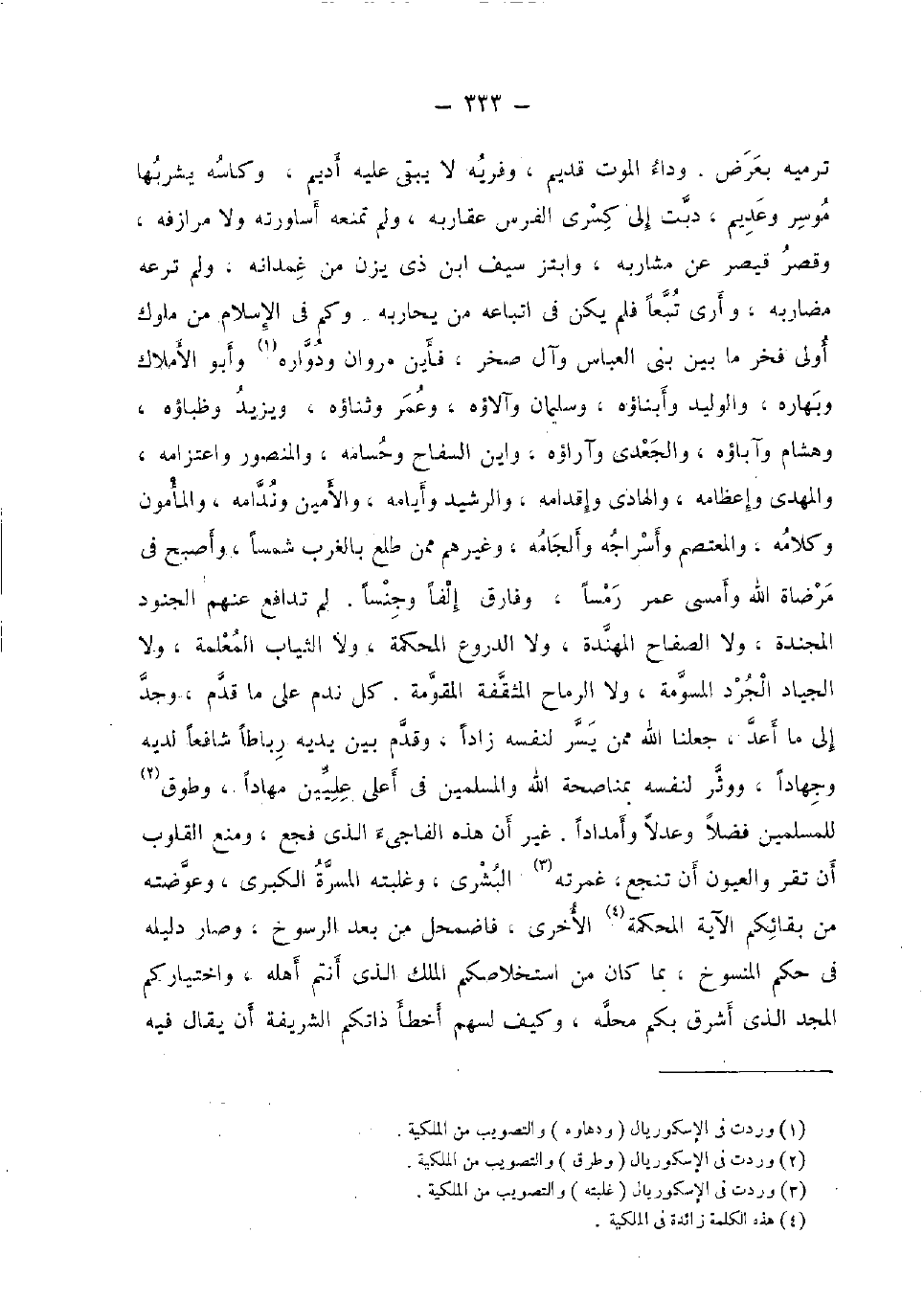 ترميه بِعرْض. وداء الْمَوْت قديم، وفريه لَا يبْقى عَلَيْهِ أَدِيم، وكاسه يشْربهَا مُوسر وعديم، دبت إِلَى كسْرَى الْفرس عقاربه، وَلم تَمنعهُ أساورته وَلَا مرازفه، وَقصر قَيْصر عَن مشاربه، وابتز سيف ابْن ذِي يزن من غمدانه، وَلم ترعه مضاربه، وَأرى تبعا فَلم يكن فِي اتِّبَاعه من يحاربه وَكم فِي الْإِسْلَام من مُلُوك أولى فَخر مَا بَين بني الْعَبَّاس وَآل صَخْر، فَأَيْنَ مَرْوَان ودواره وَأَبُو الْأَمْلَاك وبهاره، والوليد وأبناؤه، وَسليمَان وآلاؤه، وَعمر وثناؤه، وَيزِيد وظباؤه، وَهِشَام وآباؤه، والجعدي وآراؤه، وَأَيْنَ السفاح وحسامه، والمنصور واعتزامه، وَالْمهْدِي وإعظامه، وَالْهَادِي وإقدامه، والرشيد وأيامه، والأمين وندامه، والمأمون وَكَلَامه، والمعتصم وأسراجه وألجامه، وَغَيرهم مِمَّن طلع بالغرب شمسا، وَأصْبح فِي مرضاة الله وَأمسى عمر رمسا، وَفَارق إلفا وجنسا. لم تدافع عَنْهُم الْجنُود المجندة، وَلَا الصفاح المهندة، وَلَا الدروع المحكمة، وَلَا الثِّيَاب المعلمة، وَلَا الْجِيَاد الجرد المسومة، وَلَا الرماح المثقفة المقومة. كل نَدم على مَا قدم، وجد إِلَى مَا أعد، جعلنَا الله مِمَّن يسر لنَفسِهِ زادا، وَقدم بَين يَدَيْهِ رِبَاطًا شافعا لَدَيْهِ وجهادا، ووثر لنَفسِهِ بمناصحة الله وَالْمُسْلِمين فِي أَعلَى عليين مهادا، وطوق للْمُسلمين فضل وعدلا وأمدادا. غير أَن هَذِه الفاجىء الَّذِي فجع، وَمنع الْقُلُوب أَن تقر والعيون أَن تنجع، غمرته الْبُشْرَى، وغلبته المسرة الْكُبْرَى، وعوضته من بقائكم الْآيَة المحكمة الْأُخْرَى، فاضمحل من بعد الرسوخ، وَصَارَ دَلِيله فِي حكم الْمَنْسُوخ، بِمَا كَانَ من استخلاصكم الْملك الَّذِي أَنْتُم أَهله، واختياركم الْمجد الَّذِي أشرق بكم مَحَله، وَكَيف لسهم أَخطَأ ذاتكم الشَّرِيفَة أَن يُقَال فِيهِ