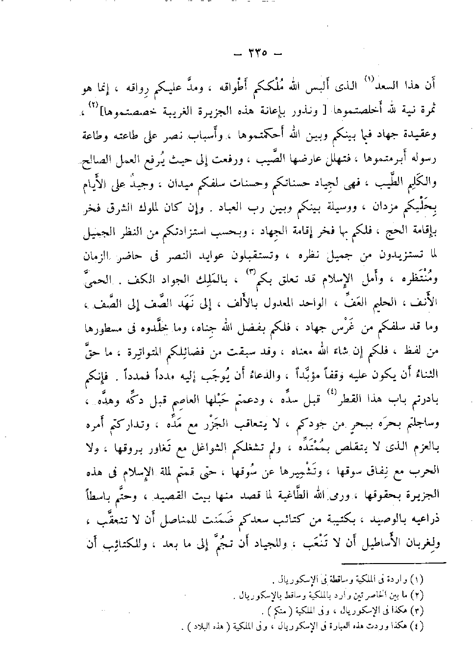 أَن هَذَا السعد الَّذِي ألبس الله ملككم أطواقه، وَمد عَلَيْكُم رواقه، إِنَّمَا هُوَ ثَمَرَة نِيَّة لله أخلصتموها [ونذور بإعانة هَذِه الجزيرة الغريبة خصصتموها] ، وعقيدة جِهَاد فِيمَا بَيْنكُم وَبَين الله أحكمتموها، وَأَسْبَاب نصر على طَاعَته وَطَاعَة رَسُوله أبرمتموها، فتهلل عارضها الصيب، وَرفعت إِلَى حَيْثُ يرفع الْعَمَل الصَّالح والكلم الطّيب، فَهِيَ لجياد حسناتكم وحسنات سلفكم ميدان، وجيد على الْأَيَّام بحليكم مزدان، ووسيلة بَيْنكُم وَبَين رب الْعباد. وَإِن كَانَ لملوك الشرق فَخر بِإِقَامَة الْحَج، فلكم بهَا فَخر إِقَامَة الْجِهَاد، وبحسب استزادتكم من النّظر الْجَمِيل لما تستزيدون من جميل نظره، وتستقبلون عوايد النَّصْر فِي حَاضر الزَّمَان ومنتظره، وأمل الْإِسْلَام قد تعلق بكم، بِالْملكِ الْجواد الْكَفّ. الْحمى الْأنف، الْحَلِيم العف، الْوَاحِد المعدول بِالْألف، إِلَى نهد الصَّفّ إِلَى الصَّفّ، وَمَا قد سلفكم من غرس جِهَاد، فلكم بِفضل الله جناه، وَمَا خلدوه فِي مسطورها من لفظ، فلكم إِن شَاءَ الله مَعْنَاهُ، وَقد سبقت من فضائلكم المتواترة، ماحق الثَّنَاء أَن يكون عَلَيْهِ وَقفا مُؤَبَّدًا، وَالدُّعَاء أَن يُوجب إِلَيْهِ مدَدا فمددا. فَإِنَّكُم بادرتم بَاب هَذَا الْقطر قبل سَده، ودعمتم حبلها العاصم قبل دكه وهده، وساجلتم بحره ببحر من جودكم، لَا يتعاقب الجزر مَعَ مده، وتداركتم أمره بالعزم الَّذِي لَا يَتَقَلَّص بممتده، وَلم تشغلكم الشواغل مَعَ تغاور بروقها، وَلَا الْحَرْب مَعَ نفاق سوقها، وتشميرها عَن سوقها، حَتَّى قُمْتُم لملة الْإِسْلَام فِي هَذِه الجزيرة بحقوقها، وَرمى الله الطاغية لما قصد مِنْهَا بَيت القصيد، وحتم باسطا ذِرَاعَيْهِ بالوصيد، بكتيبة من كتائب سعدكم ضمنت للمناصل أَن لَا تتعقب، ولغربان الأساطيل أَن لَا تنعب، وللجياد أَن تجم إِلَى مَا بعد، وللكتائب أَن