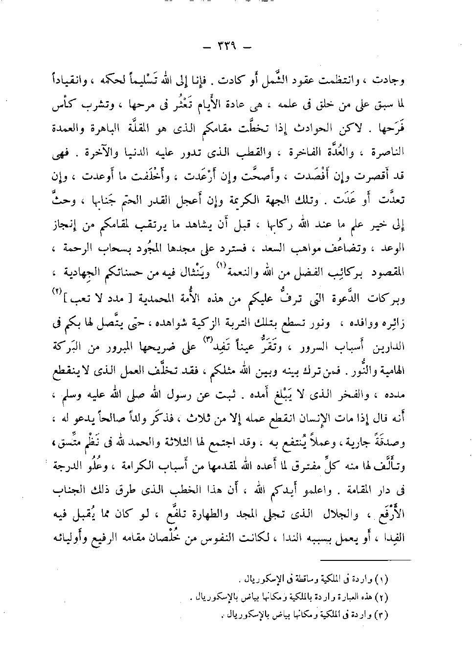 وجادت، وانتظمت عُقُود الشمل أَو كَادَت. فَإنَّا إِلَى الله تَسْلِيمًا لحكمه، وانقيادا لما سبق على من خلق فِي علمه، هِيَ عَادَة الْأَيَّام تعثر فِي مرحها، وتشرب كأس فرحها. كن الْحَوَادِث إِذا تخطت مقامكم الَّذِي هُوَ المقلة الباهرة والعمدة الناصرة، وَالْعدة الفاخرة، والقطب الَّذِي تَدور عَلَيْهِ الدُّنْيَا وَالْآخِرَة. فَهِيَ قد أقصرت وَإِن أفصدت، وأصحت وَإِن أرعدت، وأخلفت مَا أوعدت، وَإِن تعدت أَو عدت. وَتلك الْجِهَة الْكَرِيمَة وَإِن أعجل الْقدر الحتم جنابها، وحث إِلَى خير علم مَا عِنْد الله ركابهَا، قبل أَن يُشَاهد مَا يرتقب لمقامكم من إنجاز الْوَعْد، وتضاعف مواهب السعد، فسترد على مجدها المجود بسحاب الرَّحْمَة، الْمَقْصُود بركائب الْفضل من الله وَالنعْمَة وينثال فِيهِ من حسناتكم الجهادية، وبركات الدعْوَة الَّتِي تدف عَلَيْكُم من هَذِه الْأمة المحمدية [مدد لَا تَعب] زَائِدَة ووافده، وَنور تسطع بِتِلْكَ التربة الزكية شواهده، حَتَّى يتَّصل لَهَا بكم فِي الدَّاريْنِ أَسبَاب السرُور، وتقر عينا تفد على ضريحها المبرور من الْبركَة الهامية والنور. فَمن ترك بَينه وَبَين الله مثلكُمْ، فقد تخلف الْعَمَل الَّذِي لَا يَنْقَطِع مدده، وَالْفَخْر الَّذِي لَا يبلغ أمده. ثَبت عَن رَسُول الله صلى الله عَلَيْهِ وَسلم، أَنه قَالَ إِذا مَاتَ الْإِنْسَان انْقَطع عمله إِلَّا من ثَلَاث، فَذكر ولدا صَالحا يَدْعُو لَهُ، وَصدقَة جَارِيَة، وَعَملا ينْتَفع بِهِ، وَقد اجْتمع لَهَا الثَّلَاثَة وَالْحَمْد لله فِي نظم متسق، وتألف لَهَا مِنْهُ كل مفترق لما أعده الله لمقدمها من أَسبَاب الْكَرَامَة، وعلو الدرجَة فِي دَار المقامة. وَاعْلَمُوا أيدكم الله، أَن هَذَا الْخطب الَّذِي طرق ذَلِك الجناب الأرفع، والجلال الَّذِي تجلى الْمجد وَالطَّهَارَة تلفع، لَو كَانَ مِمَّا يقبل فِيهِ الفدا، أَو يعْمل بِسَبَبِهِ الندا، لكَانَتْ النُّفُوس من خلصان مقَامه الرفيع وأوليائه