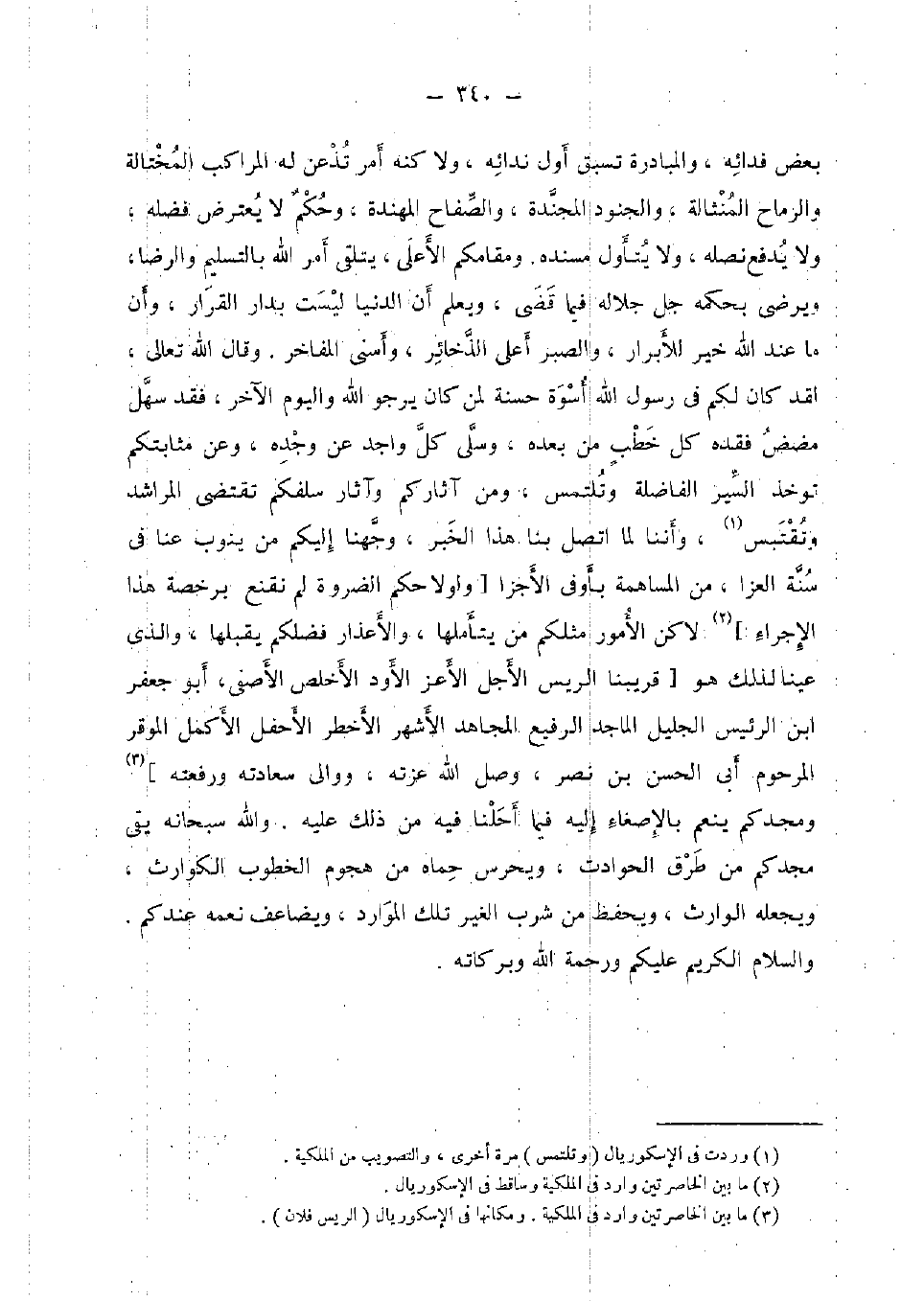 بعض فدائه، والمبادرة تسبق أول ندائه، وَلَا كنه أَمر تذعن لَهُ المراكب المختالة والرماح المنثالة، والجنود المجندة، والصفاح المهندة، وَحكم لَا يعْتَرض فَضله، وَلَا يدْفع نصله، وَلَا يتَأَوَّل مُسْنده. ومقامكم الْأَعْلَى، يتلَقَّى أَمر الله بِالتَّسْلِيمِ وَالرِّضَا، ويرضى بِحكمِهِ جلّ جَلَاله فِيمَا قضى، وَيعلم أَن الدُّنْيَا لَيست بدار الْقَرار، وَأَن مَا عِنْد الله خير للأبرار، وَالصَّبْر أَعلَى الذَّخَائِر، وأسنى المفاخر. وَقَالَ الله تَعَالَى، لقد كَانَ لكم فِي رَسُول الله أُسْوَة حَسَنَة لمن كَانَ يَرْجُو الله وَالْيَوْم الآخر، فقد سهل مضض فَقده كل خطب من بعده، وسلى كل وَاجِد عَن وجده، وَعَن مثابتكم توخذ السّير الفاضلة وتلتمس، وَمن آثَاركُم وآثار سلفكم تَقْتَضِي المراشد وتقتبس، وأننا لما اتَّصل بِنَا هَذَا الْخَبَر، وجهنا إِلَيْكُم من يَنُوب عَنَّا فِي سنة العزا، من المساهمة بأوفى الأجزا [وَلَوْلَا حكم الضروة لم نقنع بِرُخْصَة هَذَا الإجراء] لاكن الْأُمُور مثلكُمْ من يَتَأَمَّلهَا، والأعذار فَضلكُمْ يقبلهَا، وَالَّذِي عينا لذَلِك هُوَ [قريبنا الريس الْأَجَل الْأَعَز الأود الأخلص الأصفى، أَبُو جَعْفَر ابْن الرئيس الْجَلِيل الْمَاجِد الرفيع الْمُجَاهِد الْأَشْهر الأخطر الأحفل الْأَكْمَل الموقر المرحوم أبي الْحسن بن نصر، وصل الله عزته، ووالى سعادته ورفعته] ومجدكم ينعم بالإصغاء إِلَيْهِ فِيمَا أحلنا فِيهِ من ذَلِك عَلَيْهِ. وَالله سُبْحَانَهُ يقي مجدكم من طرق الحوادت، ويحرس حماه من هجوم الخطوب الكوارث، ويجعله الْوَارِث، ويحفظ من شرب الْغَيْر تِلْكَ الْمَوَارِد، ويضاعف نعمه عنْدكُمْ. وَالسَّلَام الْكَرِيم عَلَيْكُم وَرَحْمَة الله وَبَرَكَاته.