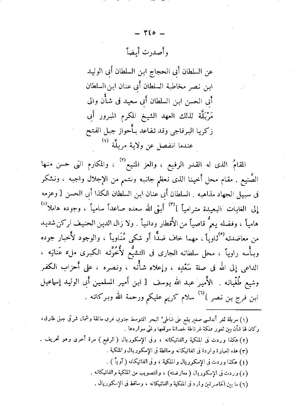 الْمقَام الَّذِي لَهُ الْقدر الرفيع، والعز المنيع، والمكارم الَّتِي حسن مِنْهَا الصَّنِيع. مقَام مَحل أخينا الَّذِي نعظم جَانِبه ونتمم من الإجلال واجبه، ونشكر فِي سَبِيل الْجِهَاد مذاهبه. السُّلْطَان أبي عنان ابْن السُّلْطَان الكذا أبي الْحسن [وعزمه إِلَى الغايات الْبَعِيدَة متراميا] أُبْقِي الله سعده صاعدا ساميا، وجوده هاملا هاميا، وفضله يعم قاصيا من الأقطار ودانيا. وَلَا زَالَ الدّين الحنيف لركن شَدِيد من معاضدته ثاويا، مهما خَافَ ضدا أَو شكى مناويا، والوجود لأخبار جوده وبأسه رَاوِيا، مَحل سُلْطَانه الْجَارِي فِي التَّشَيُّع لأخوته الْكُبْرَى ملْء عنانه، الدَّاعِي إِلَى الله فِي صلَة سعده، وإعلاء شَأْنه، وَنَصره، على أحزاب الْكفْر وشيع طغيانه. الْأَمِير عبد الله يُوسُف [ابْن أَمِير الْمُسلمين أبي الْوَلِيد إِسْمَاعِيل ابْن فرج بن نصر] سَلام كريم عَلَيْكُم وَرَحْمَة الله وَبَرَكَاته.