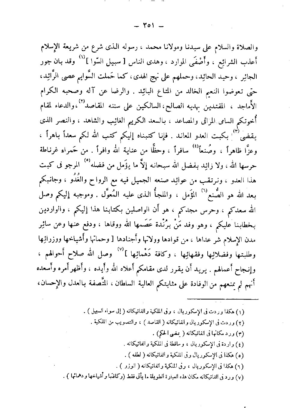 وَالصَّلَاة وَالسَّلَام على سيدنَا ومولانا مُحَمَّد، رَسُوله الَّذِي شرع من شَرِيعَة الْإِسْلَام أعذب الشَّرَائِع، وأصفى الْمَوَارِد، وَهدى النَّاس [سَبِيل السوا] وَقد بَان جور الجائر، وحيد الحائد، وَحَملهمْ على نهج الْهدى، كَمَا حملت السوايم عصى الرائد، حَتَّى تعوضوا النَّعيم الخالد من الْمَتَاع البائد. وَالرِّضَا عَن آله وَصَحبه الْكِرَام الأماجد، المقتدين بهديه الصَّالح، السالكين على سنَنه الْمَقَاصِد، وَالدُّعَاء لمقام أخوتكم السَّامِي المراقي والمصاعد، بالسعد الْكَرِيم الْغَائِب وَالشَّاهِد، والنصر الَّذِي يقْضِي بكبت الْعَدو المعاند. فَإنَّا كتبناه إِلَيْكُم كتب الله لكم سَعْدا باهرا، وَعزا ظَاهرا، وصنعا سافرا، وحظا من عناية الله وافرا. من حَمْرَاء غرناطة حرسها الله، وَلَا زَائِد بِفضل الله سُبْحَانَهُ إِلَّا مَا يؤمل من فَضله المرجو فِي كبت هَذَا الْعَدو، ونرتقب من عوائد صنعه الْجَمِيل فِيهِ مَعَ الرواح والغدو، وجانبكم بعد الله هُوَ الصنع المؤمل، والملجأ الَّذِي عَلَيْهِ الْمعول. وموجبه إِلَيْكُم وصل الله سعدكم، وحرس مجدكم، هُوَ أَن الواصلين بكتابنا هَذَا إِلَيْكُم، والواردين بخطابنا عَلَيْكُم، وَهُوَ وَفد من برندة عصمها الله ووقاها، وَدفع عَنْهَا وَعَن سَائِر مدن الْإِسْلَام شرعداها، من قوادها وولاتها وأجنادها [وحماتها وأشياخها ووزرائها وطلبتها وفضلائها وفقهائها، وكافة دهمائها] وصل الله صَلَاح أَحْوَالهم، وإنجاح أَعْمَالهم. يُرِيد أَن يُقرر لَدَى مقامكم أَعْلَاهُ الله وأيده، وَأظْهر أمره وأسعده أَنهم لم يمنعهُم من الْوِفَادَة على مثابتكم الْعَالِيَة السُّلْطَان، المتصفة بِالْعَدْلِ وَالْإِحْسَان،