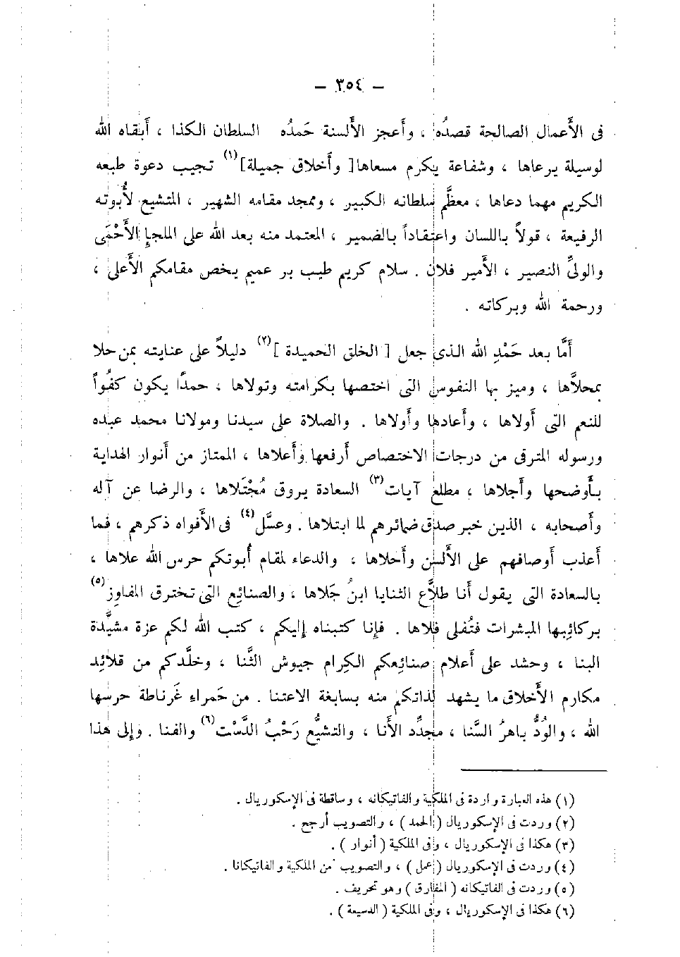 أما بعد حمد الله الَّذِي جعل [الْخلق الحميدة] دَلِيلا على عنايته بِمن حلا بمحلاها، وميز بهَا النُّفُوس الَّتِي اختصها بكرامته وتولاها، حمدا يكون كفوا للنعم الَّتِي أولاها، وأعادها وأولاها. وَالصَّلَاة على سيدنَا ومولانا مُحَمَّد عَبده وَرَسُوله المترقى من دَرَجَات الِاخْتِصَاص أرفعها وأعلاها، الممتاز من أنوار الْهِدَايَة بأوضحها وأجلاها، مطلع آيَات السَّعَادَة يروق مجتلاها، وَالرِّضَا عَن آله وَأَصْحَابه، الَّذين خبر صدق ضمائرهم لما ابتلاها. وَعسل فِي الأفواه ذكرهم، فَمَا أعذب أوصافهم على الألسن وأحلاها، وَالدُّعَاء لمقام أبوتكم حرس الله علاها، بالسعادة الَّتِي يَقُول أَنا طلاع الثنايا ابْن جلاها، والصنائع الَّتِي تخترق المفاوز بركائبها الْمُبَشِّرَات فتفلى فلاها. فَإنَّا كتبناه إِلَيْكُم، كتب الله لكم عزة مشيدة الْبَنَّا، وحشد على أَعْلَام صنائعكم الْكِرَام جيوش الثنا، وخلدكم من قلائد مَكَارِم الْأَخْلَاق مَا يشْهد لذاتكم مِنْهُ بسابغة الاعتنا. من حَمْرَاء غرناطة حرسها الله، والود باهر السنا، مُجَدد الأنا، والتشيع رحب الدست والفنا. وَإِلَى هَذَا