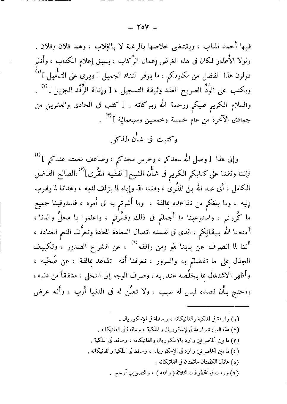وَإِلَى هَذَا [وصل الله سعدكم، وحرس مجدكم، وضاعف نعْمَته عنْدكُمْ] فإننا وقفنا على كتابكُمْ الْكَرِيم فِي شَأْن الشَّيْخ [الْفَقِيه الْمقري] ، الصَّالح الْفَاضِل الْكَامِل، أبي عبد الله بن الْمقري، وفقنا الله وإياه لما يزلف لَدَيْهِ، وهدانا لما يقرب إِلَيْهِ، وَمَا بَلغَكُمْ من تقاعده بمالقة، وَمَا أشرتم بِهِ فِي أمره، فاستوفينا جَمِيع مَا كررتم، واستوعبنا مَا أجملتم فِي ذَلِك وفسرتم، وَاعْلَمُوا يَا مَحل والدنا، أمتعنا الله ببقائكم، الَّذِي فِي ضمنه اتِّصَال السَّعَادَة الْمُعَادَة وتعرف النعم الْمُعْتَادَة، أننا لما انْصَرف عَن بابنا هُوَ وَمن رافقه، عَن انْشِرَاح الصُّدُور، وتكييف الجذل على مَا تفضلتم بِهِ وَالسُّرُور، تعرفنا أَنه تقاعد بمالقة، عَن صَحبه، وَأظْهر الِاشْتِغَال بِمَا يخلصه عِنْد ربه، وَصرف الْوَجْه إِلَى التخلي، مشفقا من ذَنبه، وَاحْتج بِأَن قَصده لَيْسَ لَهُ سَبَب، وَلَا تعين لَهُ فِي الدُّنْيَا أرب، وَأَنه عرض