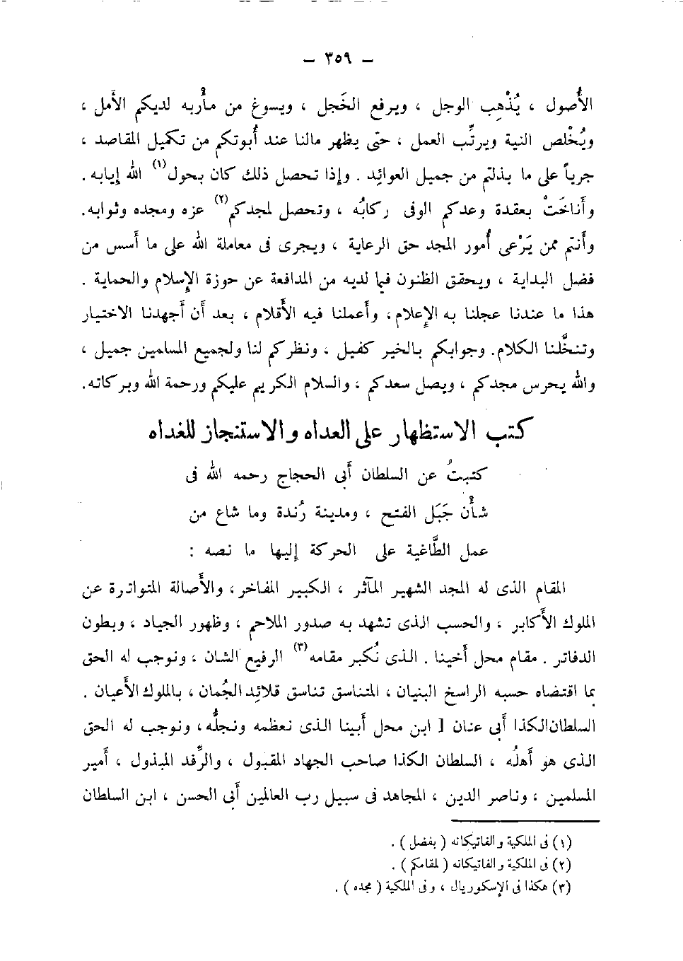 الْأُصُول، يذهب الوجل، وَيرْفَع الخجل، ويسوغ من مأربه لديكم الأمل، ويخلص النِّيَّة ويرتب الْعَمَل، حَتَّى يظْهر مالنا عِنْد أبوتكم من تَكْمِيل الْمَقَاصِد، جَريا على مَا بذلتم من جميل العوائد. وَإِذا تحصل ذَلِك كَانَ بحول الله إيابه. وأناخت بعقدة وَعدكُم الوفي ركابه، وَتحصل لمجدكم عزه ومجده وثوابه. وَأَنْتُم مِمَّن يرْعَى أُمُور الْمجد حق الرِّعَايَة، وَيجْرِي فِي مُعَاملَة الله على مَا أسس من فضل الْبِدَايَة، ويحقق الظنون فِيمَا لَدَيْهِ من المدافعة عَن حوزة الْإِسْلَام والحماية. هَذَا مَا عندنَا عجلنا بِهِ الْإِعْلَام، وأعملنا فِيهِ الأقلام، بعد أَن أجهدنا الِاخْتِيَار وتنخلنا الْكَلَام. وجوابكم بِالْخَيرِ كَفِيل، ونظركم لنا وَلِجَمِيعِ الْمُسلمين جميل، وَالله يحرس مجدكم، ويصل سعدكم، وَالسَّلَام الْكَرِيم عَلَيْكُم وَرَحْمَة الله وَبَرَكَاته.