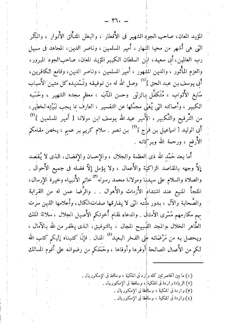 الْمُؤَيد المعان، صَاحب الْجُود الشهير فِي الأقطار، والبطل المتألق الْأَنْوَار، والمآثر الَّتِي هِيَ أشهر من محيا النَّهَار، أَمِير الْمُسلمين، وناصر الدّين، الْمُجَاهِد فِي سَبِيل رب الْعَالمين، أبي سعيد، ابْن السُّلْطَان الْكَبِير الْمُؤَيد المعان، صَاحب الْجُود المبرور، والعزم الْمَأْثُور، وَالدّين الْمَشْهُور، أَمِير الْمُسلمين، وناصر الدّين، وقامع الْكَافرين، أبي يُوسُف بن عبد الْحق] وصل الله لَهُ من توفيقه وتسديده كل متين الْأَسْبَاب سابغ الأثواب، متكفل بالزلفى وَحسن المآب، مُعظم مجده الشهير، وحسبه الْكَبِير، وأصالته الَّتِي يُغني مجملها عَن التَّفْسِير، الْعَارِف بِمَا يجب لبيته الخطير، من الترفيع وَالتَّكْبِير، الْأَمِير عبد الله يُوسُف ابْن مَوْلَانَا [أَمِير الْمُسلمين] أبي الْوَلِيد [إِسْمَاعِيل بن فرج] بن نصر. سَلام كريم بر عميم، يخص مقامكم الأرفع، وَرَحْمَة الله وَبَرَكَاته.