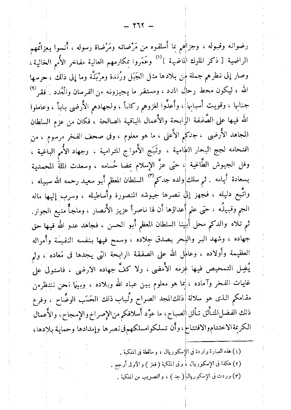 رضوانه وقبوله، وجزاهم بِمَا أسلفوه من مرضاته ومرضاة رَسُوله، أنسوا بعزائمهم الراضية [ذكر الْمُلُوك الْمَاضِيَة] وعمروا بمكارمهم الْعَالِيَة مفاخر الْأُمَم الخالية، وَصَارَ إِلَى نظرهم جملَة من بلادها مثل الْجَبَل ورندة ومربلة وَمَا إِلَى ذَلِك، حرسها الله، ليَكُون محط رحال المدد، ومستقر مَا يجيزونه من الفرسان وَالْعدَد. فقر جنابها، وقويت أَسبَابهَا، وَأَعدُّوا لغزوهم ركابا، ولجهادهم الأرضي بَابا، وعاملوا الله فِيهَا على الصَّفْقَة الرابحة والأعمال الْبَاقِيَة الصَّالِحَة، فَكَانَ من عزم السُّلْطَان الْمُجَاهِد الارضي، جدكم الْأَعْلَى، مَا هُوَ مَعْلُوم، وَفِي صحف الْفَخر مرسوم، من اقتحامه لجج الْبحار الطامية، وثبج الأمواج المترامية، وَجِهَاد الْأُمَم الباغية، وفل الجيوش الطاغية، حَتَّى عز الْإِسْلَام بمضا حسامه، وسعدت الْملَّة المحمدية بسعادة أَيَّامه. ثمَّ سلك وَلَده جدكم السُّلْطَان الْمُعظم أَبُو سعيد رَحمَه الله سَبيله، وَاتبع دَلِيله، فَجهز إِلَى نصرها جيوشه المنصورة وأساطيله، وسرب إِلَيْهَا مَاله الجم وقبيله، حَتَّى علم أعداؤها أَن لَهَا ناصرا عَزِيز الْأَنْصَار، وملجأ منيع الْجوَار. ثمَّ تلاه والدكم مَحل أَبينَا السُّلْطَان الْمُعظم أَبُو الْحسن، فَجَاهد عَدو الله فِيهَا حق جهاده، وَشهد الْبر وَالْبَحْر بِصدق جلاده، وسمح فِيهَا بِنَفسِهِ النفيسة وأمواله الْعَظِيمَة وَأَوْلَاده، وعامل الله على الصَّفْقَة الرابحة الَّتِي يجدهَا فِي معاده، وَلم يضل التمحيص فِيهَا عزمه الأمضى، وَلَا كف جهاده الأرضي، فاستولى على غايات الْفَخر وآماده، بِمَا هُوَ مَعْلُوم بَين عباد الله وبلاده، وبينما نَحن نَنْتَظِر من مقامكم الَّذِي هُوَ سلالة ذَلِك الْمجد الصراح ولباب ذَلِك الْحسب الوضاح، وَفرع ذَلِك الْفضل المتألق تألق الصَّباح، مَا عود أسلافكم من الإصراخ والإسجاح، والأعمال الْكَرِيمَة الاختتام والافتتاح، وَأَن تسلكوا مسلكهم فِي نصرها وإمدادها وحماية بلادها،
