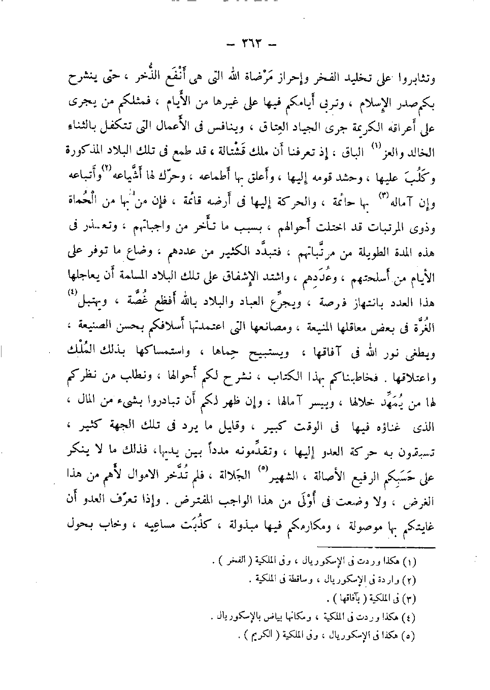 وتثابروا على تخليد الْفَخر وإحراز مرضاة الله الَّتِي هِيَ أَنْفَع الذخر، حَتَّى ينشرح بكم صدر الْإِسْلَام، وتربى أيامكم فِيهَا على غَيرهَا من الْأَيَّام، فمثلكم من يجْرِي على أعراقه الْكَرِيمَة جرى الْجِيَاد الْعتاق، وينافس فِي الْأَعْمَال الَّتِي تتكفل بالثناء الخالد والعز الباق، إِذْ تعرفنا أَن ملك قشتالة، قد طمع فِي تِلْكَ الْبِلَاد الْمَذْكُورَة وكلب عَلَيْهَا، وحشد قومه إِلَيْهَا، وأعلق بهَا أطماعه، وحرك لَهَا أشياعه وَأَتْبَاعه وَإِن آماله بهَا حائمة، وَالْحَرَكَة إِلَيْهَا فِي أرضه قَائِمَة، فَإِن من بهَا من الحماة وَذَوي المرتبات قد اختلت أَحْوَالهم، بِسَبَب مَا تَأَخّر من واجباتهم، وَتعذر فِي هَذِه الْمدَّة الطَّوِيلَة من مرتباتهم، فتبدد الْكثير من عَددهمْ، وَضاع مَا توفر على الْأَيَّام من أسلحتهم، وعددهم، وَاشْتَدَّ الإشفاق على تِلْكَ الْبِلَاد الْمسلمَة أَن يعاجلها هَذَا الْعدَد بانتهاز فرْصَة، ويجرع الْعباد والبلاد بِاللَّه أفظع غُصَّة، ويهتبل الْغرَّة فِي بعض معاقلها المنيعة، ومصانعها الَّتِي اعتمدتها أسلافكم بِحسن الصنيعة، ويطغى نور الله فِي آفاقها، ويستبيح حماها، واستمساكها بذلك الْملك واعتلاقها. فخاطبناكم بِهَذَا الْكتاب، نشرح لكم أحوالها، ونطلب من نظركم لَهَا من يمهد خلالها، وييسر آمالها، وَإِن ظهر لكم أَن تبَادرُوا بِشَيْء من المَال، الَّذِي غناؤه فِيهَا فِي الْوَقْت كَبِير، وَقَلِيل مَا يرد فِي تِلْكَ الْجِهَة كثير، تسبقون بِهِ حَرَكَة الْعَدو إِلَيْهَا، وتقدمونه مدَدا بَين يَديهَا، فَذَلِك مَا لَا يُنكر على حسبكم الرفيع الْأَصَالَة، الشهير الْجَلالَة، فَلم تدخر الْأَمْوَال لأهم من هَذَا الْغَرَض، وَلَا وضعت فِي أولى من هَذَا الْوَاجِب المفترض. وَإِذا تعرف الْعَدو أَن غايتكم بهَا مَوْصُولَة، ومكارمكم فِيهَا مبذولة، كذبت مساعيه، وخاب بحول