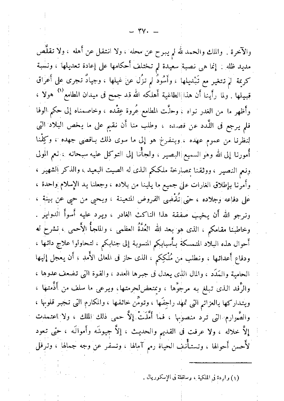 وَالْآخِرَة. وَالْملك وَالْحَمْد لله لم يبرح عَن مَحَله، وَلَا انْتقل عَن أَهله، وَلَا تقلص مديد ظله. إِنَّمَا هِيَ نصبة سعيدة لم تخْتَلف أَحْكَامهَا على إِعَادَة تعديلها، وَنسبَة كَرِيمَة لم تَتَغَيَّر مَعَ تبديلها، وأسود لم تزل عَن غيلها، وجياد تجْرِي على أعراق قبيلها. وَلما رَأينَا أَن هَذَا الطاغية أهلكه الله قد جمح فِي ميدان المطامع هولا، وَأظْهر مَا من الْغدر نَوَاه، وحلت المطامع عُرْوَة عقده، وخاصمناه إِلَى حكم الوفا فَلم يرجع فِي اللدد عَن قَصده، وَطلب منا أَن نُقِيم على مَا يخص الْبِلَاد الَّتِي لنظرنا من عُمُوم عَهده، ويتفرغ هُوَ إِلَى مَا سوى ذَلِك بأقصى جهده، وكلنَا أمورنا إِلَى الله وَهُوَ السَّمِيع الْبَصِير، ولجأنا إِلَى التَّوَكُّل عَلَيْهِ سُبْحَانَهُ، نعم الْمولى وَنعم النصير، ووثقنا بمصارخة ملككم الَّذِي لَهُ الصيت الْبعيد، وَالذكر الشهير، وأمرنا بِإِطْلَاق الغارات على جَمِيع مَا يلينا من بِلَاده، وَجَعَلنَا يَد الْإِسْلَام وَاحِدَة، على دفاعه وجلاده، حَتَّى تقضى الْفُرُوض المتعينة، وَيحيى من حَيّ عَن بَيِّنَة، وَنَرْجُو الله أَن يخيب صَفْقَة هَذَا الناكث الغادر، وَيرد عَلَيْهِ أَسْوَأ الدواير. وخاطبنا مقامكم، الَّذِي هُوَ بعد الله الْعدة الْعُظْمَى، والملجأ الأحمى، نشرح لَهُ أَحْوَال هَذِه الْبِلَاد المتمسكة بأسبابكم المنسوبة إِلَى جنابكم، لتحاولوا علاج دائها، ودفاع أعدائها، ونطلب من ملككم، الَّذِي حَاز فِي الْمَعَالِي الأمد، أَن يعجل إِلَيْهَا الحامية والمدد، وَالْمَال الَّذِي يعدل فِي جبرها الْعدَد، وَالْقُوَّة الَّتِي تضعف عدوها، والرفد الَّذِي تبلغ بِهِ مرجوها، ويمتعض لحرمتها، ويرعى مَا سلف من أذمتها، ويتداركها بالعزائم الَّتِي تمهد راجفها، وتومن خائفها، والمكارم الَّتِي تجبر قلوبها، والصوارم الَّتِي ترد منصوبها، فَمَا أملت إِلَّا حمى ذَلِك الْملك، وَلَا اعتمدت إِلَّا خلاله، وَلَا عرفت فِي الْقَدِيم والْحَدِيث، إِلَّا جيوشه وأمواله، حَتَّى تعود لأحسن أحوالها، وتستأنف الْحَيَاة رمم آمالها، وتسفر عَن وَجه جمَالهَا، وترفل