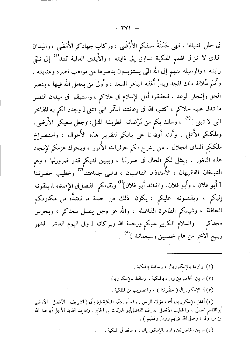 فِي حلل اقتبالها، فَهِيَ حَسَنَة سلفكم الأرضي، وركاب جهادكم الأمضى، والميدان الَّذِي لَا تزَال الهمم الملكية تسابق إِلَى غَايَته، وَالْأَيْدِي الْعَالِيَة تمتد إِلَى تلقى رايته، والوسيلة مِنْهُم إِلَى الله الَّتِي يستزيدون بنصرها من مواهب نَصره وعنايته. وَأَنْتُم سلالة ذَلِك الْمجد وَبدر أفقه الباهر السعد، وَأولى من يُعَامل الله فِيهَا، بنصر الْحق وإنجاز الْوَعْد، فحققوا أمل الْإِسْلَام فِي علاكم، واستبقوا فِي ميدان النَّصْر مَا تدل عَلَيْهِ حلاكم، كتب الله فِي إعانتنا المآثر الَّتِي تتلى [وجدد لكم بِهِ المفاخر الَّتِي لَا تبلى] ، وسلك بكم من مرضاته الطَّرِيقَة المثلى، وَجعل سعيكم الأرضى، وملككم الْأَعْلَى. وأننا أوفدنا على بَابَكُمْ لتقرير هَذِه الْأَحْوَال، واستصراخ ملككم السَّامِي الْجلَال، من يشْرَح لكم جزئيات الْأُمُور، ويحرك عزمكم لإنجاد هَذِه الثغور، ويمثل لكم الْحَال فِي صورتهَا، وَيبين لديكم قدر ضرورتها، وهم الشَّيْخَانِ الفقيهان، الأستاذان القاضيان، قَاضِي جماعتنا وخطيب حضرتنا [أَبُو فلَان، وَأَبُو فلَان، والقائد أَبُو فلَان] ولمقامكم الْفضل فِي الإصغاء لما يلقونه إِلَيْكُم، ويقصونه عَلَيْكُم، يكون ذَلِك من جملَة مَا نعتده من مكارمكم الحافلة، وشيمكم الطاهرة الفاضلة، وَالله عز وَجل يصل سعدكم، ويحرس مجدكم. وَالسَّلَام الْكَرِيم عَلَيْكُم وَرَحْمَة الله وَبَرَكَاته [وَفِي الْيَوْم الْعَاشِر لشهر ربيع الآخر من عَام خمسين وَسَبْعمائة] .