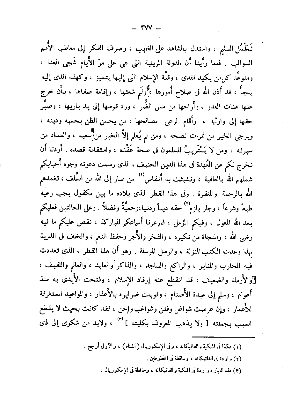 تململ السَّلِيم، وَاسْتدلَّ بِالشَّاهِدِ على الغايب، وَصرف الْفِكر إِلَى معاطب الْأُمَم السوالب. فَلَمَّا رَأينَا أَن الدولة المرينية الَّتِي هِيَ على مر الْأَيَّام شجى العدا، ومتوعد كل من يكيد الْهدى، وقبة الْإِسْلَام الَّتِي إِلَيْهَا يتَمَيَّز، وكهفه الَّذِي إِلَيْهِ يلجأ، قد أذن الله فِي صَلَاح أمورها، وَلم شعثها، وَإِقَامَة صفاها، بِأَن خرج عَنْهَا هَنَات الْعَدو، وأراحها من مس الضّر، ورد قوسها إِلَى يَد باريها، وصير حَقّهَا إِلَى وارثها، وَأقَام لرعى مصالحها، من يحسن الظَّن بِحَسبِهِ وَدينه، ويرجى الْخَيْر من ثَمَرَات نصحه، وَمن لم يعلم إِلَّا الْخَيْر من سَعْيه، والسداد من سيرته، وَمن لَا يستريب الْمُسلمُونَ فِي صِحَة عقده، واستقامة قَصده. أردنَا أَن نخرج لكم عَن الْعهْدَة فِي هَذَا الدّين الحنيف، الَّذِي رسمت دَعوته وُجُوه أحبابكم شملهم الله بالعافية، وتشبثت بِهِ أنفاس من صَار إِلَى الله من السّلف، تغمدهم الله بِالرَّحْمَةِ وَالْمَغْفِرَة. وَفِي هَذَا الْقطر الَّذِي بِلَاده مَا بَين مكفول يجب رعيه طبعا وَشرعا، وجار يلْزم حَقه دينا وَدُنْيا، وحمية وفضلا. وعَلى الْحَالَتَيْنِ فَعَلَيْكُم بعد الله الْمعول، وَفِيكُمْ المؤمل، فارعونا أسماعكم الْمُبَارَكَة، نقص عَلَيْكُم مَا فِيهِ رَضِي الله، والمنجاة من نكيره، وَالْفَخْر وَالْأَجْر وَحفظ النعم، وَالْخلف فِي الذُّرِّيَّة بِهَذَا وعدت الْكتب الْمنزلَة، وَالرسل الْمُرْسلَة. وَهُوَ أَن هَذَا الْقطر، الَّذِي تعدّدت فِيهِ الْمُحَارب والمنابر، والراكع والساجد، والذاكر وَالْعَابِد، والعالم واللفيف، والأرملة والضعيف، قد انْقَطع عَنهُ إرفاد الْإِسْلَام، وَفتحت الْأَيْدِي بِهِ مُنْذُ أَعْوَام، وَسلم إِلَى عَبدة الْأَصْنَام، وقوبلت ضرايره بالأعذار، والمواعيد المستغرقة للأعمار، وَإِن عرضت شواغل وَفتن وشواغب وإحن، فقد كَانَت بِحَيْثُ لَا يقطع السَّبَب بجملته بولا يذهب الْمَعْرُوف بكليته] ، وَلَا بُد من شكوى إِلَى ذِي