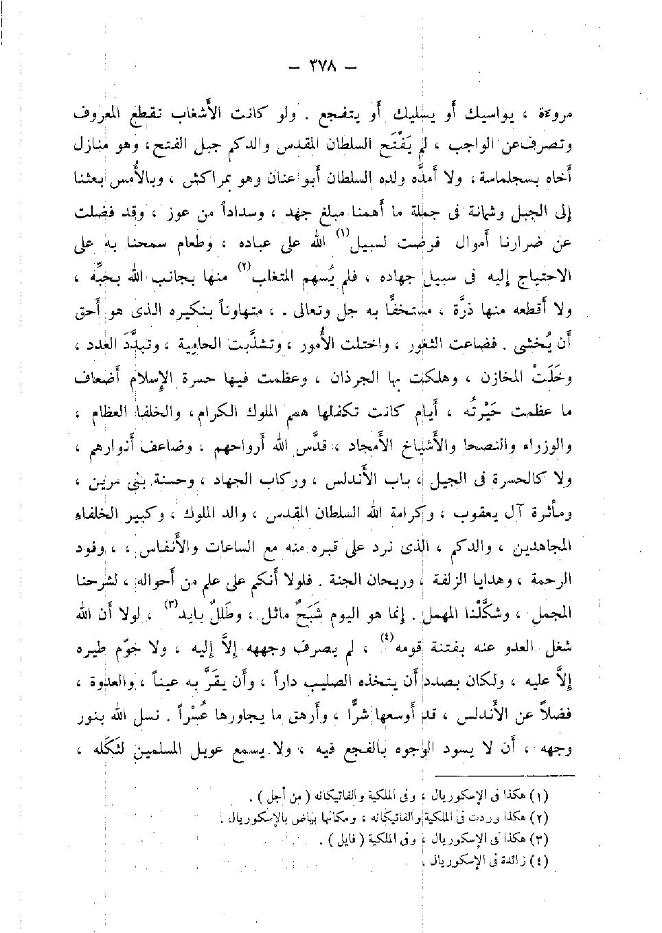 مُرُوءَة، يواسيك أَو يسليك أَو يتفجع. وَلَو كَانَت الأشغاب تقطع الْمَعْرُوف وَتصرف عَن الْوَاجِب، لم يفتح السُّلْطَان الْمُقَدّس والدكم جبل الْفَتْح، وَهُوَ منَازِل أَخَاهُ بسجلماسة، وَلَا أمده وَلَده السُّلْطَان أَبُو عنان وَهُوَ بمراكش، وبالأمس بعثنَا إِلَى الْجَبَل وشمانة فِي جملَة مَا أهمنا مبلغ جهد، وسدادا من عوز، وَقد فضلت عَن ضرارنا أَمْوَال فرضت لسبيل الله على عباده، وَطَعَام سمحنا بِهِ على الاحتياح إِلَيْهِ فِي سَبِيل جهاده، فَلم يُسهم المتغلب مِنْهَا بِجَانِب الله بحبه، وَلَا أقطعه مِنْهَا ذرة، مستخفا بِهِ جلّ وَتَعَالَى، متهاونا بنكيره الَّذِي هُوَ أَحَق أَن يخْشَى. فَضَاعَت الثغور، واختلت الْأُمُور، وتشذبت الحامية، وتبدد الْعدَد، وخلت المخازن، وَهَلَكت بهَا الجرذان، وعظمت فِيهَا حسرة الْإِسْلَام أَضْعَاف مَا عظمت حيرته، أَيَّام كَانَت تكفلها همم الْمُلُوك الْكِرَام، والخلفا الْعِظَام، والوزراء والنصحا والأشياخ الأمجاد، قدس الله أَرْوَاحهم، وضاعف أنوارهم، وَلَا كالحسرة فِي الجيل، بَاب الأندلس، وركاب الْجِهَاد، وحسنة بني مرين، ومأثرة آل يَعْقُوب، وكرامة الله السُّلْطَان الْمُقَدّس، وَالِد الْمُلُوك، وكبير الْخُلَفَاء الْمُجَاهدين، والدكم، الَّذِي نرد على قَبره مِنْهُ مَعَ السَّاعَات والأنفاس، وُفُود الرَّحْمَة، وهدايا الزلفة، وَرَيْحَان الْجنَّة. فلولا أَنكُمْ على علم من أَحْوَاله، لشرحنا الْمُجْمل، وشكلنا المهمل. إِنَّمَا هُوَ الْيَوْم شبح ماثل، وطلل بايد، لَوْلَا أَن الله شغل الْعَدو عَنهُ بفتنة قومه، لم يصرف وجههه إِلَّا إِلَيْهِ، وَلَا حوم طيره إِلَّا عَلَيْهِ، ولكان بصدد أَن يَتَّخِذهُ الصَّلِيب دَارا، وَأَن يقر بِهِ عينا، والعدوة، فضلا عَن الأندلس، قد أوسعها شرا، وأرهق مَا يجاورها عسرا. نسل الله بِنور وَجهه، أَن لَا يسود الْوُجُوه بالفجع فِيهِ، وَلَا يسمع عويل الْمُسلمين لثكله،