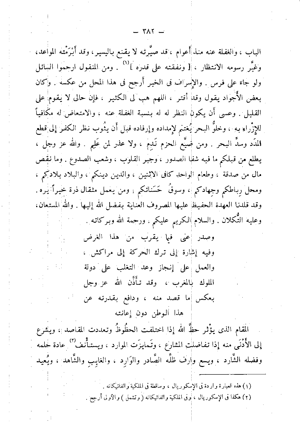 الْبَاب، والغفلة عَنهُ مُنْذُ أَعْوَام، قد صيرته لَا يقنع باليسير، وَقد أبرمته المواعد وَغير رسومه الِانْتِظَار، [وَنَفَقَته على قدره] . وَمن الْمَنْقُول ارحموا السَّائِل وَلَو جَاءَ على فرس. والإسراف فِي الْخَيْر أرجح فِي هَذَا الْمحل من عَكسه. وَكَانَ بعض الأجواد يَقُول وَقد أقتر، اللَّهُمَّ هَب لي الْكثير، فَإِن حَالي لَا يقوم على الْقَلِيل. وَعَسَى أَن يكون النّظر لَهُ بِنِسْبَة الْغَفْلَة عَنهُ، والامتعاض لَهُ مكافيا للإزراء بِهِ، وخلو الْبَحْر يغتنم لإمداده وإرفاده قبل أَن يثوب نظر الْكفْر إِلَى قطع المدد وسد الْبَحْر. وَمن ضيع الحزم نَدم، وَلَا عذر لمن علم. وَالله عز وَجل، يطلع من قبلكُمْ مَا فَهِيَ شفا الصُّدُور، وجبر الْقُلُوب، وَشعب الصدوع. وَمَا نقص مَال من صَدَقَة، وَطَعَام الْوَاحِد كَافِي الِاثْنَيْنِ، وَالدّين دينكُمْ، والبلاد بِلَادكُمْ، وَمحل رباطكم وجهادكم، وسوق حسناتكم. وَمن يعْمل مِثْقَال ذرة خيرا يره. وَقد قلدنا الْعهْدَة الحفيظ عَلَيْهَا المصروف الْعِنَايَة بِفضل الله إِلَيْهَا. وَالله الْمُسْتَعَان، وَعَلِيهِ التكلان. وَالسَّلَام الْكَرِيم عَلَيْكُم. وَرَحْمَة الله وَبَرَكَاته.