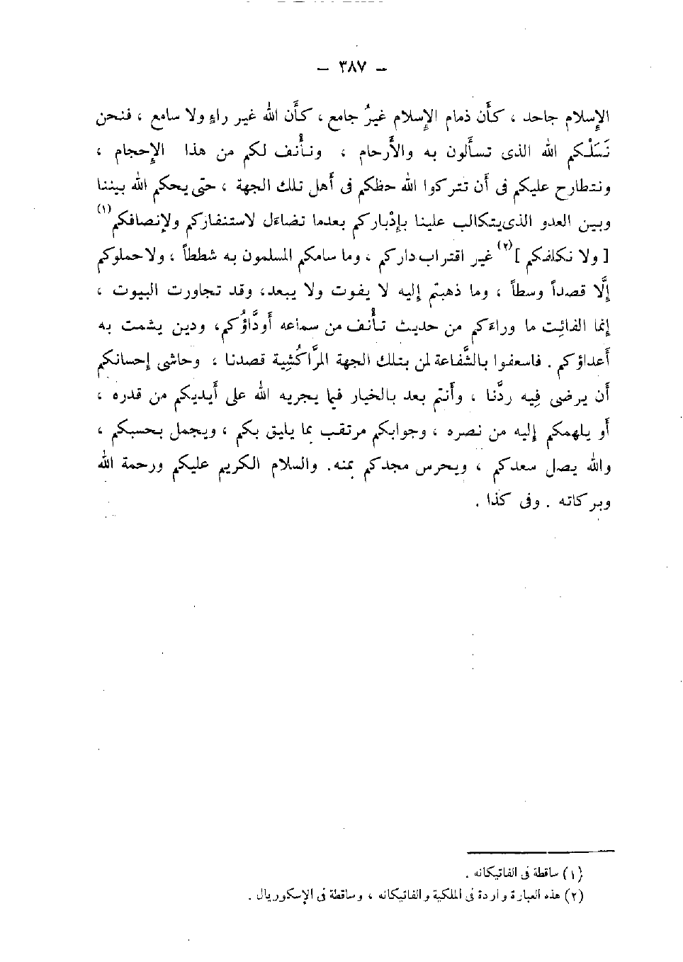 الْإِسْلَام جَاحد، كَأَن ذمام الْإِسْلَام غير جَامع، كَأَن الله غير رَاء وَلَا سامع، فَنحْن نسلكم الله الَّذِي تسْأَلُون بِهِ والأرحام، ونأنف لكم من هَذَا الإحجام، ونتطارح عَلَيْكُم فِي أَن تتركوا الله حظكم فِي أهل تِلْكَ الْجِهَة، حَتَّى يحكم الله بَيْننَا وَبَين الْعَدو الَّذِي يتكالب علينا بإدباركم بَعْدَمَا تضاءل لاستنفاركم ولإنصافكم [وَلَا نكلفكم] غير اقتراب داركم، وَمَا سامكم الْمُسلمُونَ بِهِ شططا، وَلَا حملوكم إِلَّا قصدا وسطا، وَمَا ذهبتم إِلَيْهِ لَا يفوت وَلَا يبعد، وَقد تجاورت الْبيُوت، إِنَّمَا الْفَائِت مَا وراءكم من حَدِيث تأنف من سَمَاعه أوداؤكم، وَدين يشمت بِهِ أعداؤكم. فاسعفوا بالشفاعة لمن بِتِلْكَ الْجِهَة المراكشية قصدنا، وحاشى إحسانكم أَن يرضى فِيهِ ردنا، وَأَنْتُم بعد بِالْخِيَارِ فِيمَا يجريه الله على أَيْدِيكُم من قدره، أَو يلهمكم إِلَيْهِ من نَصره، وجوابكم مرتقب بِمَا يَلِيق بكم، ويجمل بحسبكم، وَالله يصل سعدكم، ويحرس مجدكم بمنه. وَالسَّلَام الْكَرِيم عَلَيْكُم وَرَحْمَة الله وَبَرَكَاته. وَفِي كَذَا.