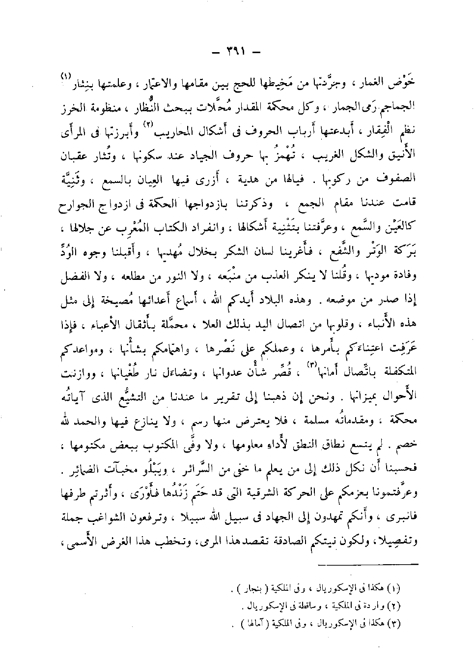 خوض الغمار، وجردتها من مخيطها لِلْحَجِّ بَين مقَامهَا والاعتمار، وعلمتها بنثار الجماجم رمي الْجمار، وكل محكمَة الْمِقْدَار محلات ببحث النظار، منظومة الخرز نظم الفقار، أبدعتها أَرْبَاب الْحُرُوف فِي أشكال المحاريب وأبرزتها فِي المرأى الأنيق والشكل الْغَرِيب، تهمز بهَا حُرُوف الْجِيَاد عِنْد سكونها، وتثار عقبان الصُّفُوف من ركُوبهَا. فيالها من هَدِيَّة، أزرى فِيهَا العيان بِالسَّمْعِ، وثنية قَامَت عندنَا مقَام الْجمع، وذكرتنا بازدواجها الْحِكْمَة فِي ازدواج الْجَوَارِح كَالْعَيْنِ والسمع، وعرفتنا بتثنية أشكالها، وانفراد الْكتاب المعرب عَن جلالها، بركَة الْوتر وَالشَّفْع، فأغرينا لِسَان الشُّكْر بخلال مهديها، وأقبلنا وُجُوه الود وفادة موديها، وَقُلْنَا لَا يُنكر العذب من منبعه، وَلَا النُّور من مطلعه، وَلَا الْفضل إِذا صدر من مَوْضِعه. وَهَذِه الْبِلَاد أيدكم الله، أسماع أعدائها مصيخة إِلَى مثل هَذِه الأنباء، وقلوبها من اتِّصَال الْيَد بذلك الْعلَا، محملة بأثقال الأعباء، فَإِذا عرفت اعتناءكم بأمرها، وعملكم على نصرها، واهتمامكم بشأنها، ومواعدكم المتكفلة باتصال أمانها، قصر شَأْن عدوانها، وتضاءل نَار طغيانها، ووازنت الْأَحْوَال بميزاتها. وَنحن إِن ذَهَبْنَا إِلَى تَقْرِير مَا عندنَا من التَّشَيُّع الَّذِي آيَاته محكمَة، ومقدماته مسلمة، فَلَا يعْتَرض مِنْهَا رسم، وَلَا يُنَازع فِيهَا وَالْحَمْد لله خصم. لم يَتَّسِع نطاق النُّطْق لأَدَاء معلومها، وَلَا وفى الْمَكْتُوب بِبَعْض مكتومها، فحسبنا أَن نكل ذَلِك إِلَى من يعلم مَا خَفِي من السرائر، ويبلو مخبآت الضمائر. وعرفتمونا بعزمكم على الْحَرَكَة الشرقية الَّتِي قد حتم زندها فأورى، وأثرتم طرفها فانبرى، وأنكم تمهدون إِلَى الْجِهَاد فِي سَبِيل الله سَبِيلا، وترفعون الشواغب جملَة وتفصيلا، وَلكَون نيتكم الصادقة تقصد هَذَا المرمى، وتخطب هَذَا الْغَرَض الأسمى،