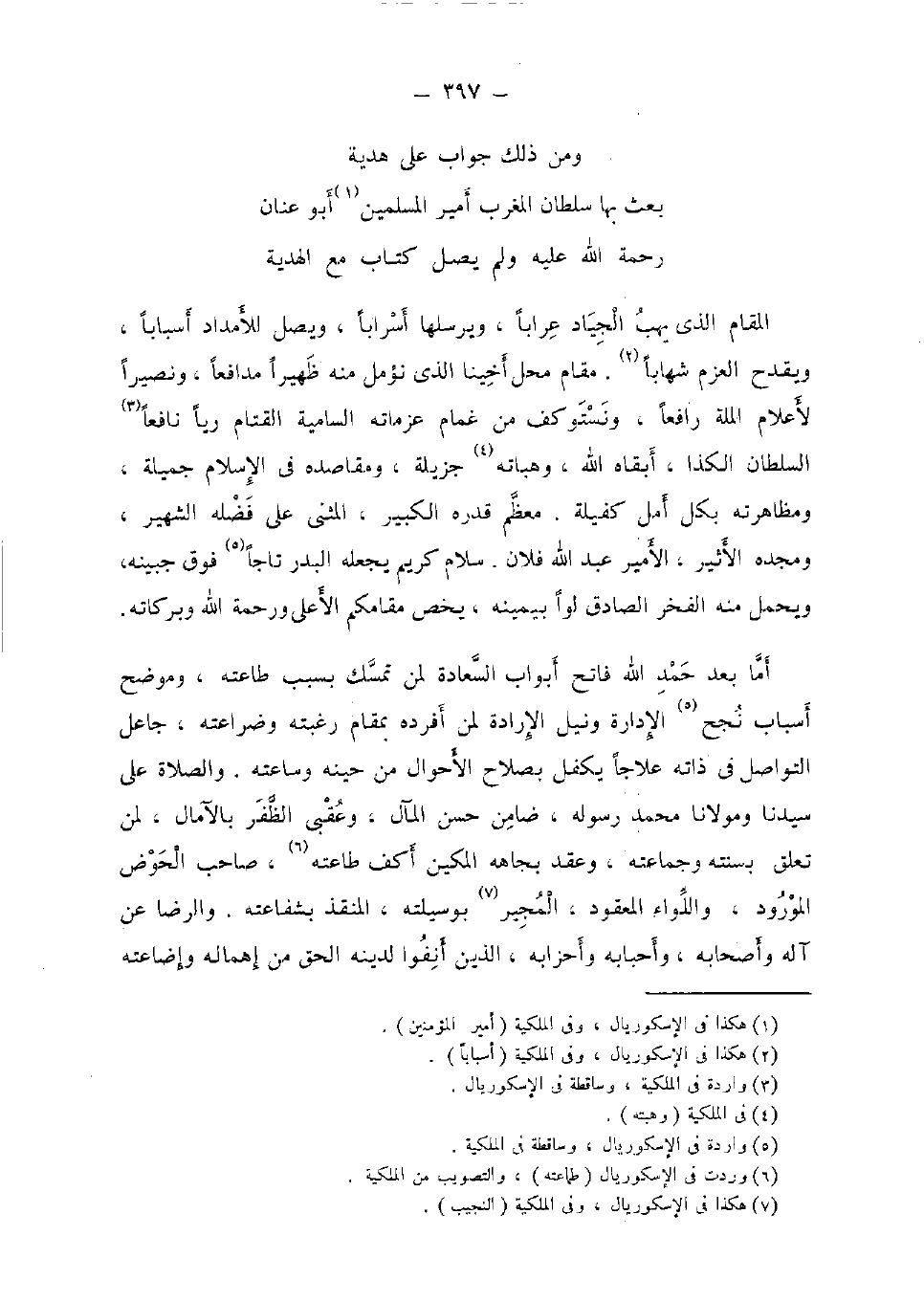 الْمقَام الَّذِي يهب الْجِيَاد عرابا، ويرسلها أسرابا، ويصل للأمداد أَسبَاب، ويقدح الْعَزْم شهابا. مقَام مَحل أخينا الَّذِي نؤمل مِنْهُ ظهيرا مدافعا، ونصيرا لأعلام الْملَّة رَافعا، ونستوكف من غمام عزماته السامية القتام ريا نَافِعًا السُّلْطَان الكذا، أبقاه الله وهباته جزيلة، ومقاصده فِي الْإِسْلَام جميلَة، ومظاهرته بِكُل أمل كفيلة. مُعظم قدره الْكَبِير، الْمثنى على فَضله الشهير، ومجده الْأَثِير، الْأَمِير عبد الله فلَان. سَلام كريم يَجعله الْبَدْر تاجا فَوق جَبينه، وَيحمل مِنْهُ الْفَخر الصَّادِق لوا بِيَمِينِهِ، يخص مقامكم الْأَعْلَى وَرَحْمَة الله وَبَرَكَاته.