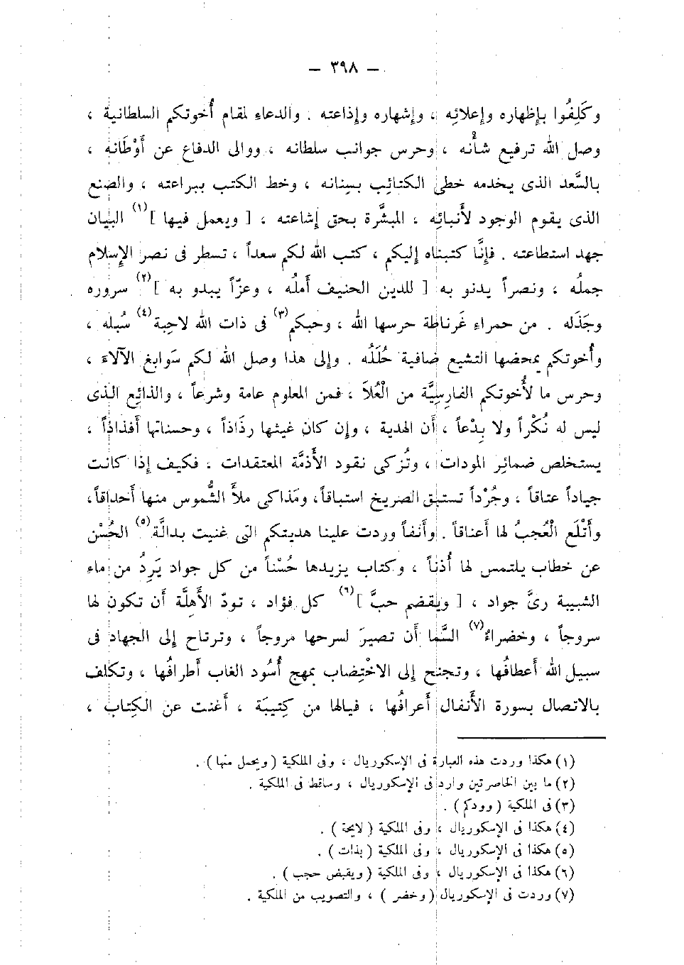 وكلفوا بإظهاره وإعلائه، وإشهاره وإذاعته. وَالدُّعَاء لمقام أخوتكم السُّلْطَانِيَّة، وصل الله ترفيع شَأْنه، وحرس جَوَانِب سُلْطَانه، وَولى الدفاع عَن أوطانه، بالسعد الَّذِي يَخْدمه خطى الْكَتَائِب بسنانه، وَخط الْكتب ببراعة، والصنع الَّذِي يقوم الْوُجُود لأنبائه، المبشرة بِحَق إشاعته، [وَيعْمل فِيهَا] الْبَيَان جهد استطاعته. فَإنَّا كتبناه إِلَيْكُم، كتب الله لكم سَعْدا، تسطر فِي نصر الْإِسْلَام جمله، ونصرا يدنو بِهِ [للدّين الحنيف أمله، وَعزا يَبْدُو بِهِ] سروره وجدله. من حَمْرَاء غرناطة حرسها الله، وحبكم فِي ذَات الله لاحبة سبله، وأخوتكم يمحضها التَّشَيُّع ضافية حلله. وَإِلَى هَذَا وصل الله لكم سوابغ الآلاء، وحرس مَا لأخوتكم الفارسية من الْعلَا، فَمن الْمَعْلُوم عَامَّة وَشرعا، والذائع الَّذِي لَيْسَ لَهُ نكرا وَلَا بدعا، أَن الْهَدِيَّة، وَإِن كَانَ غيثها رذاذا، وحسناتها أفذاذا، يستخلص ضمائر المودات، وتزكى نقود الأذمة المعتقدات، فَكيف إِذا كَانَت جيادا عتاقا، وجردا تستبق الصَّرِيخ استباقا، ومذاكي مَلأ الشموس مِنْهَا أحداقا، وأتلع الْعجب لَهَا أعناقا. وأنفا وَردت علينا هديتكم الَّتِي غنيت بدالة الْحسن عَن خطاب يلْتَمس لَهَا أذنا، وَكتاب يزيدها حسنا من كل جواد يرد من مَاء الشبيبة ري جواد، [ويقضم حب] كل فؤاد، تود الْأَهِلّة أَن تكون لَهَا سروجا، وخضراء السما أَن تصير لسرحها مروجا، وترتاح إِلَى الْجِهَاد فِي سَبِيل الله أعطافها، وتجنح إِلَى الاختضاب بمهج أسود الغاب أطرافها، وتكلف بالاتصال بِسُورَة الْأَنْفَال أعرافها، فيا لَهَا من كَتِيبَة، أغنت عَن الْكتاب،