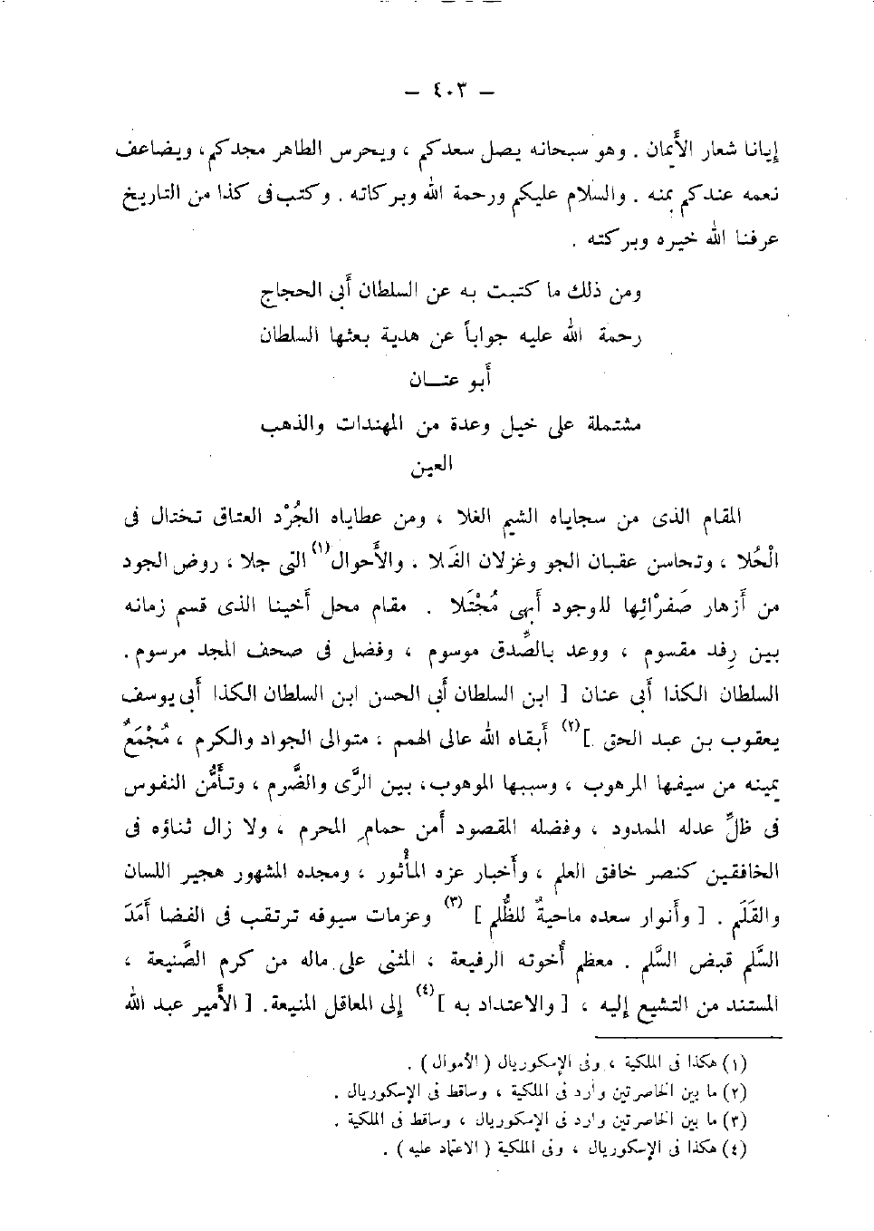 الْمقَام الَّذِي من سجاياه الشيم الغلا، وَمن عطاياه الجرد الْعتاق تختال فِي الحلا، وتحاسن عقبان الجو وغزلان الفلا، وَالْأَحْوَال الَّتِي جلا، روض الْجُود من أزهار صفرائها للوجود أبهى مجتلا. مقَام مَحل أخينا الَّذِي قسم زَمَانه بَين رفد مقسوم، ووعد بِالصّدقِ مَوْسُوم، وَفضل فِي صحف الْمجد مرسوم. السُّلْطَان الكذا أبي عنان [ابْن السُّلْطَان أبي الْحسن ابْن السُّلْطَان الكذا أبي يُوسُف يَعْقُوب بن عبد الْحق] أبقاه الله عالي الهمم، متوالي الْجواد وَالْكَرم، مجمع يَمِينه من سيفها المرهوب، وسببها الْمَوْهُوب، بَين الرّيّ والضرم، وتأمن النُّفُوس فِي ظلّ عدله الْمَمْدُود، وفضله الْمَقْصُود أَمن حمام الْمحرم، وَلَا زَالَ ثَنَاؤُهُ فِي الْخَافِقين كنصر خافق الْعلم، وأخبار عزه الْمَأْثُور، ومجده الْمَشْهُور هجير اللِّسَان والقلم. [وأنوار سعده ماحية للظلم] وعزمات سيوفه ترتقب فِي الفضا أمد السّلم قبض السّلم. مُعظم أخوته الرفيعة، الْمثنى على مَاله من كرم الصنيعة، الْمُسْتَند من التَّشَيُّع إِلَيْهِ، [والاعتداد بِهِ] إِلَى المعاقل المنيعة. [الْأَمِير عبد الله