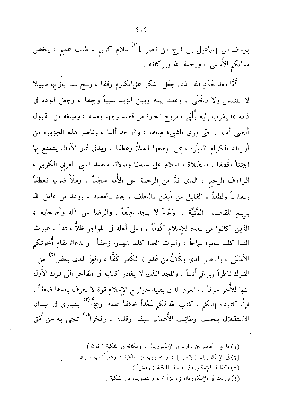 أما بعد حمد الله الَّذِي جعل الشُّكْر على المكارم وَقفا، ونهج مِنْهُ بازايها سَبِيلا لَا يلتبس وَلَا يخفى، وَعقد بَينه وَبَين الْمَزِيد سَببا وحلفا، وَجعل الْمَوَدَّة فِي ذَاته مِمَّا يقرب إِلَيْهِ زلفى، مربح تِجَارَة من قصد وَجهه بِعَمَلِهِ، ومبلغه من الْقبُول أقْصَى أمله، حَتَّى يرى الشَّيْء ضعفا، وَالْوَاحد ألفا، وناصر هَذِه الجزيرة من أوليائه الْكِرَام السِّيرَة، بِمن يوسعها فضلا وعطفا، ويدني ثمار الآمال يتمتع بهَا اجتنا وقطفا. وَالصَّلَاة وَالسَّلَام على سيدنَا ومولانا مُحَمَّد النَّبِي الْعَرَبِيّ الْكَرِيم، الرؤوف الرَّحِيم، الَّذِي قد من الرَّحْمَة على الْأمة سجفا، وملأ قلوبها تعطفا وتقاربا ولطفا، القايل من أَيقَن بالخلف، جاد بِالْعَطِيَّةِ، ووعد من عَامل الله بِرِبْح الْمَقَاصِد السّنيَّة، وَعدا لَا يجد خلفا. وَالرِّضَا عَن آله وَأَصْحَابه، الَّذين كَانُوا من بعده لِلْإِسْلَامِ كهفا، وعَلى ى أَهله فِي الهواجر ظلا ملتفا، غيوث الندا كلما ساموا سماحا، وليوث العدا كلما شهدُوا زحفا. وَالدُّعَاء لقام أخوتكم الأسمى، بالنصر الَّذِي يكف من عدوان الْكفْر كفا، والعز الَّذِي يغض من الشّرك نَاظرا ويرغم أنفًا، وَالْمجد الَّذِي لَا يُغَادر كِتَابه فِي المفاخر الَّتِي ترك الأول مِنْهَا للأخر حرفا، والعزم الَّذِي يُفِيد جوارح الْإِسْلَام قُوَّة لَا تعرف بعْدهَا ضعفا. فَإنَّا كتبناه إِلَيْكُم، كتب الله لكم سَعْدا خافقا علمه. وَعزا يتبارى فِي ميدان الِاسْتِقْلَال بِحَسب وظائف الْأَعْمَال سَيْفه وقلمه، وفخرا تجلى بِهِ عَن أفق