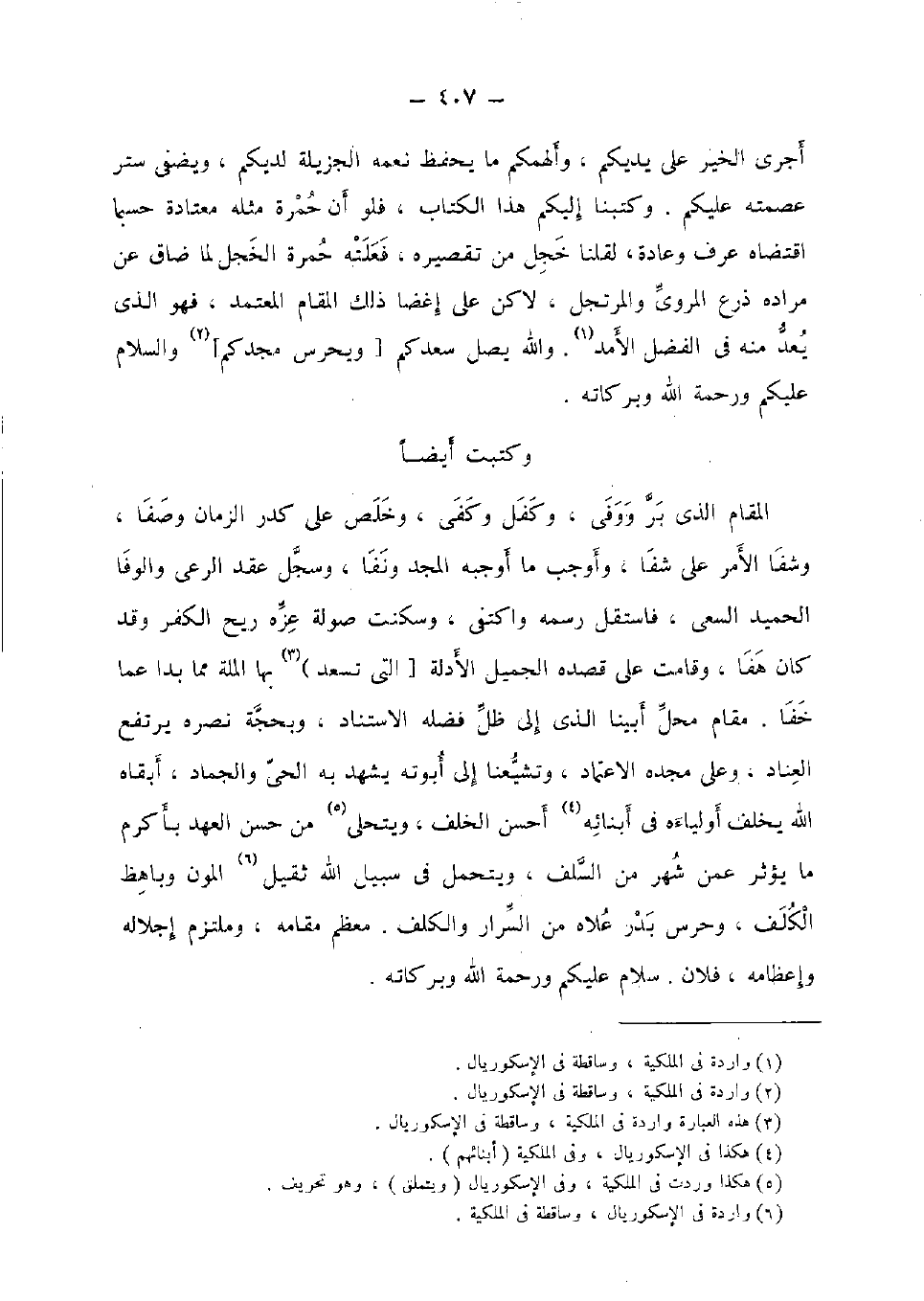 الْمقَام الَّذِي بر ووفى، وكفل وَكفى، وخلص على كدر الزَّمَان وَصفا، وشفا الْأَمر على شفا، وَأوجب مَا أوجبه الْمجد ونفا، وسجل عقد الرعى والوفا الحميد السَّعْي، فاستقل رسمه وَاكْتفى، وسكنت صولة عزه ريح الْكفْر وَقد كَانَ هفا، وَقَامَت على قَصده الْجَمِيل الْأَدِلَّة [الَّتِي تسعد] بهَا الْملَّة مِمَّا بدا عَمَّا خفا. مقَام مَحل أَبينَا الَّذِي إِلَى ظلّ فَضله الِاسْتِنَاد، بِحجَّة نَصره يرْتَفع العناد، وعَلى مجده الِاعْتِمَاد، وتشيعنا إِلَى أبوته يشْهد بِهِ الْحَيّ والجماد، أبقاه العناد، وعَلى مجده الِاعْتِمَاد، وتشيعنا إِلَى أبوته يشْهد بِهِ الْحَيّ والجماد، أبقاه الله يخلف أولياءه فِي أبنائه أحسن الْخلف، ويتحلى من حسن الْعَهْد بأكرم مَا يُؤثر عَمَّن شهر من السّلف، ويتحمل فِي سَبِيل الله ثقيل المون وباهظ الكلف، وحرس بدر علاهُ من السرَار والكلف. مُعظم مقَامه، وملتزم إجلاله وإعظامه، فلَان. سَلام عَلَيْكُم وَرَحْمَة الله وَبَرَكَاته.