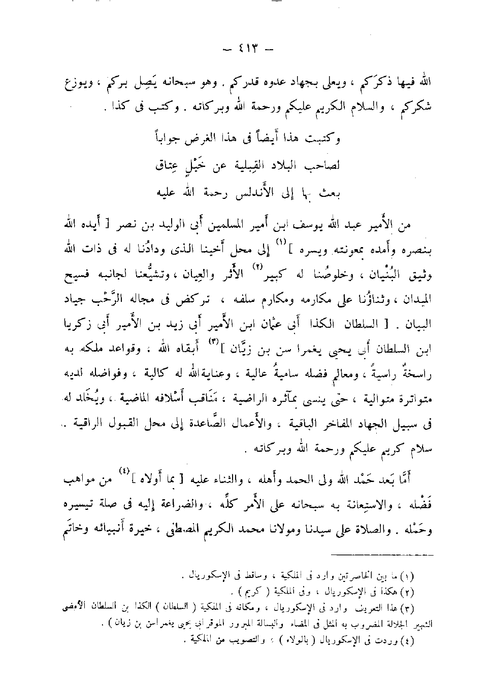 من الْأَمِير عبد الله يُوسُف ابْن أَمِير الْمُسلمين أبي الْوَلِيد بن نصر [أيده الله بنصره وأمده بمعونته ويسره] إِلَى مَحل أخينا الَّذِي ودادنا لَهُ فِي ذَات الله وثيق الْبُنيان، وخلوصنا لَهُ كَبِير الْأَثر والعيان، وتشيعنا لجانبه فسيح الميدان، وثناؤنا على مكارمه وَمَكَارِم سلفه، تركض فِي مجاله الرحب جِيَاد ابْن السُّلْطَان أبي يحيى يغمرا سنّ بن زيان] أبقاه الله، وقو اعد ملكه بِهِ راسخة راسية، ومعالم فَضله سامية عالية، وعناية الله لَهُ كالية، وفواضله لَدَيْهِ متواترة مُتَوَالِيَة، حَتَّى ينسى بمآثره الراضية، مَنَاقِب أسلافه الْمَاضِيَة، ويخلد لَهُ فِي سَبِيل الْجِهَاد المفاخر الْبَاقِيَة، والأعمال الصاعدة إِلَى مَحل الْقبُول الراقية. سَلام كريم عَلَيْكُم وَرَحْمَة الله وَبَرَكَاته.